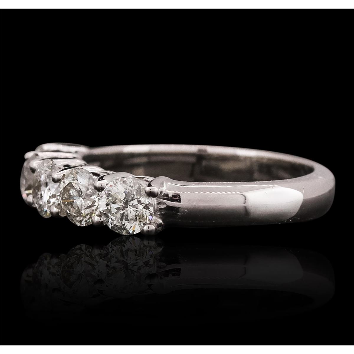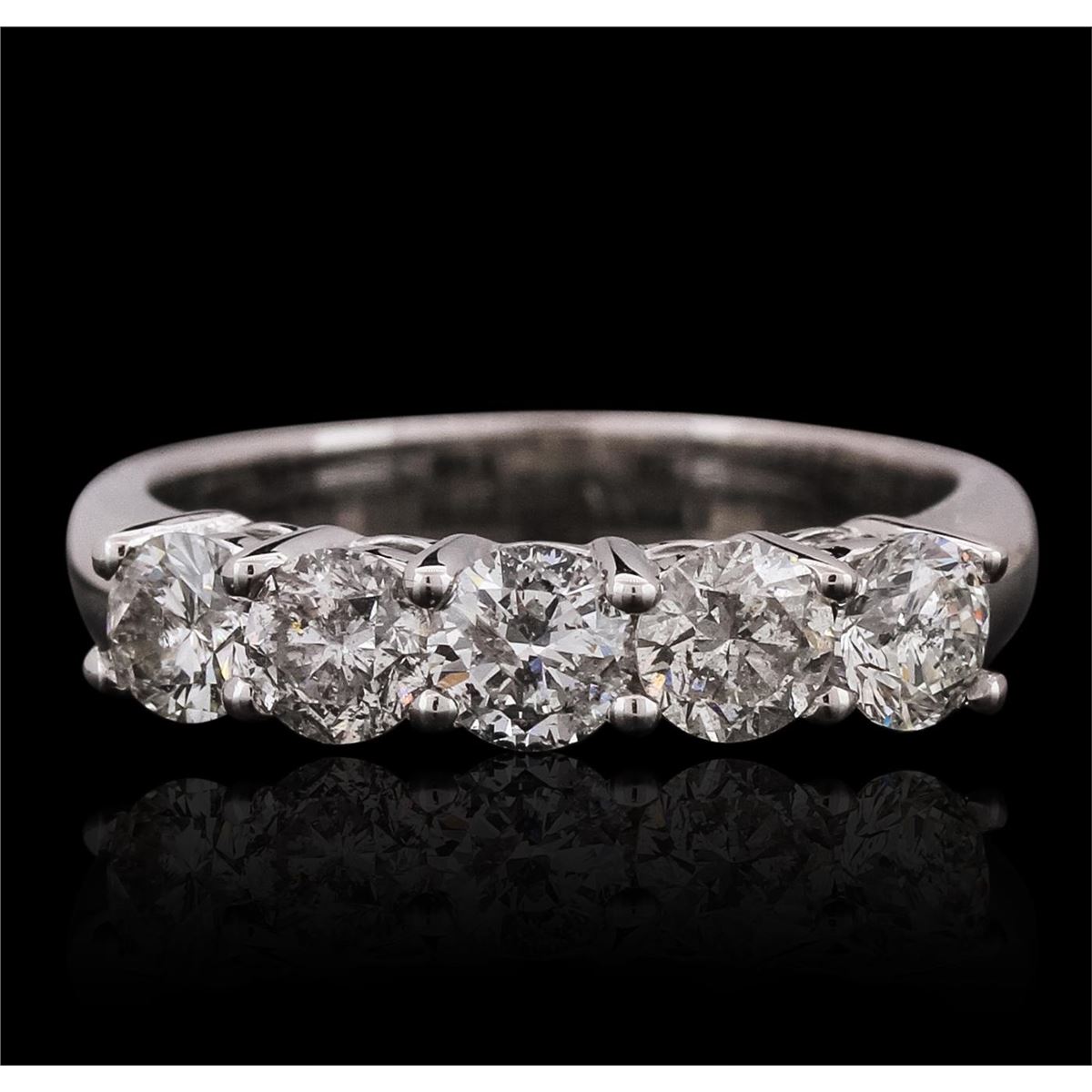 One electronically tested 14KT white gold ladies cast anniversary ring with a bright polish finish. Identified with markings of "14K". Condition is new. Containing: Five prong set round brilliant cut diamonds, measuring 4.00 - 4.00 x 2.40mm (depth est.) approximate total weight of 5 Stones = 1.17ct. Clarity: I-1 to I-2. Color: I - J, Cut is Good. All diamonds are graded in the mounting, unless otherwise stated. Total Weight of Diamonds 1.17ct. Total Weight of Ring 4.40 grams. GGL Appraised at $4,500.00.