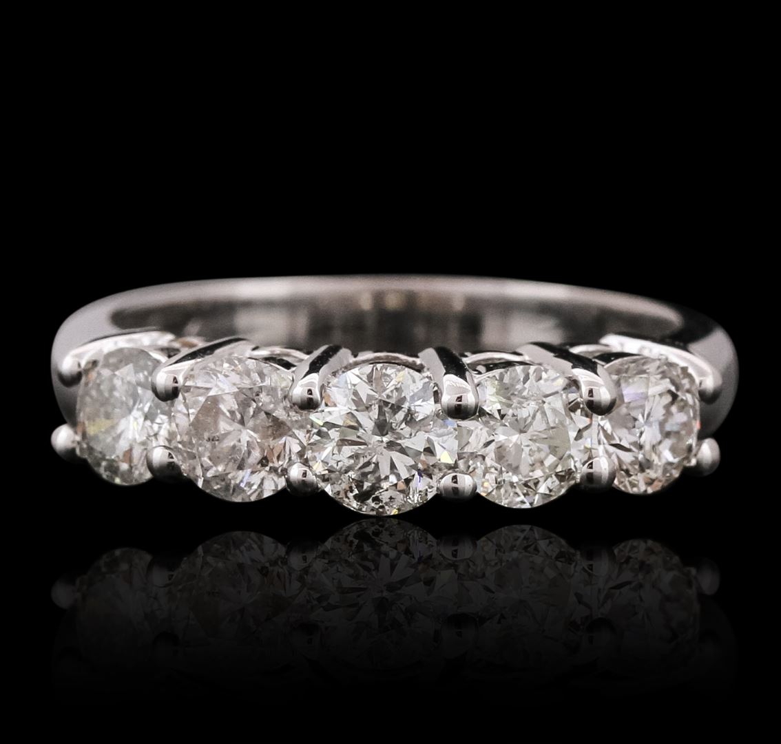 One electronically tested 14KT white gold ladies cast anniversary ring with a bright polish finish. Identified with markings of "14K". Condition is new. Containing: Five prong set round brilliant cut diamonds, measuring 4.00 - 4.00 x 2.40mm (depth est.) approximate total weight of 5 Stones = 1.17ct. Clarity: I-1 to I-2. Color: H - J, Cut is Good. All diamonds are graded in the mounting, unless otherwise stated. Total Weight of Diamonds 1.17ct. Total Weight of Ring 4.40 grams. GGL Appraised at $4,545.00.