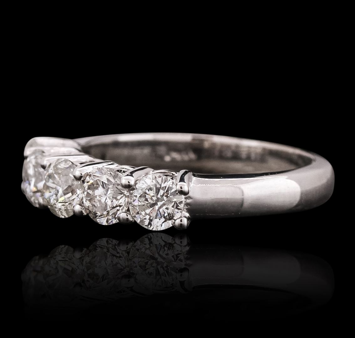 One electronically tested 14KT white gold ladies cast anniversary ring with a bright polish finish. Identified with markings of "14K". Condition is new. Containing: Five prong set round brilliant cut diamonds, measuring 4.00 - 4.00 x 2.40mm (depth est.) approximate total weight of 5 Stones = 1.17ct. Clarity: I-1 to I-2. Color: I - J, Cut is Good. All diamonds are graded in the mounting, unless otherwise stated. Total Weight of Diamonds 1.17ct. Total Weight of Ring 4.20 grams. GGL Appraised at $4,430.00.