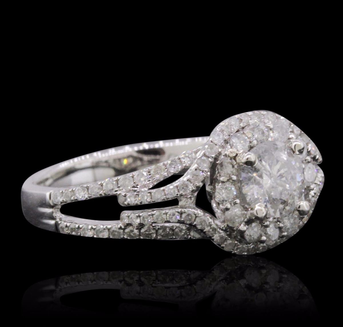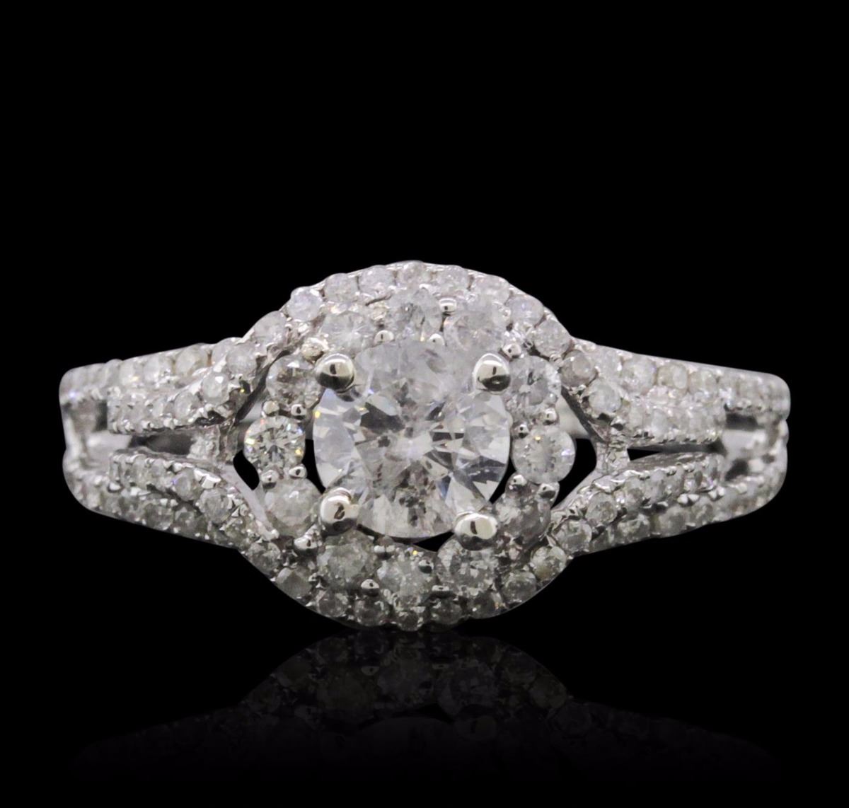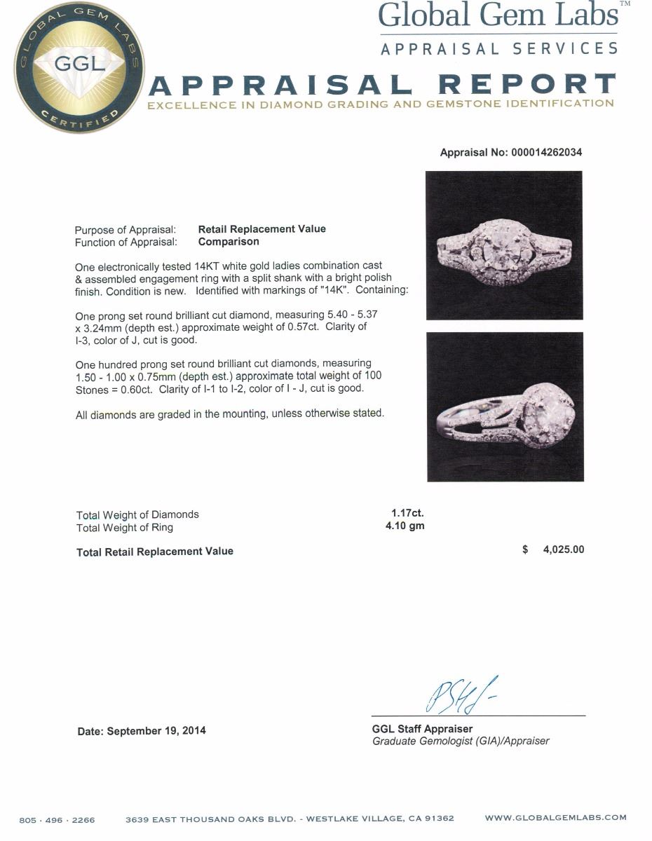 One electronically tested 14KT white gold ladies combination cast & assembled engagement ring with a split shank with a bright polish finish. Identified with markings of "14K". Condition is new. Containing: One prong set round brilliant cut diamond, measuring 5.40 - 5.37 x 3.24mm (depth est.) approximate weight of 0.57ct. Clarity: I-3. Color: J, Cut is Good. One Hundred prong set round brilliant cut diamonds, measuring 1.50 - 1.00 x 0.75mm (depth est.) approximate total weight of 100 Stones = 0.60ct. Clarity: I-1 to I-2. Color: I - J, Cut is Good. All diamonds are graded in the mounting, unless otherwise stated. Total Weight of Diamonds 1.17ct. Total Weight of Ring 4.10 grams. GGL Appraised at $4,025.00.