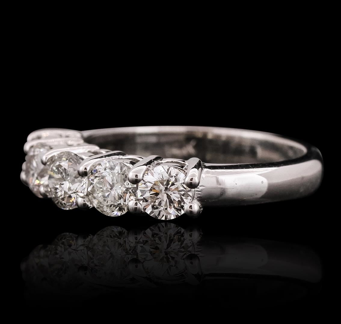One electronically tested 14KT white gold ladies cast anniversary ring with a bright polish finish. Identified with markings of "14K". Condition is new. Containing: Five prong set round brilliant cut diamonds, measuring 4.00 - 4.00 x 2.40mm (depth est.) approximate total weight of 5 Stones = 1.17ct. Clarity: I-1 to I-2. Color: H - J, Cut is Good. All diamonds are graded in the mounting, unless otherwise stated. Total Weight of Diamonds 1.17ct. Total Weight of Ring 4.40 grams. GGL Appraised at $4,545.00.