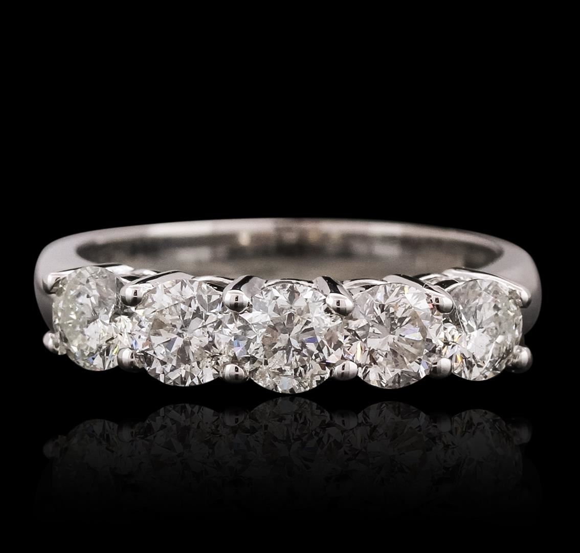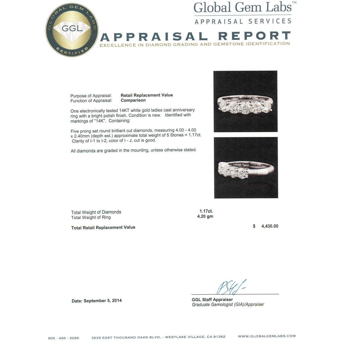 One electronically tested 14KT white gold ladies cast anniversary ring with a bright polish finish. Identified with markings of "14K". Condition is new. Containing: Five prong set round brilliant cut diamonds, measuring 4.00 - 4.00 x 2.40mm (depth est.) approximate total weight of 5 Stones = 1.17ct. Clarity: I-1 to I-2. Color: I - J, Cut is Good. All diamonds are graded in the mounting, unless otherwise stated. Total Weight of Diamonds 1.17ct. Total Weight of Ring 4.20 grams. GGL Appraised at $4,430.00.