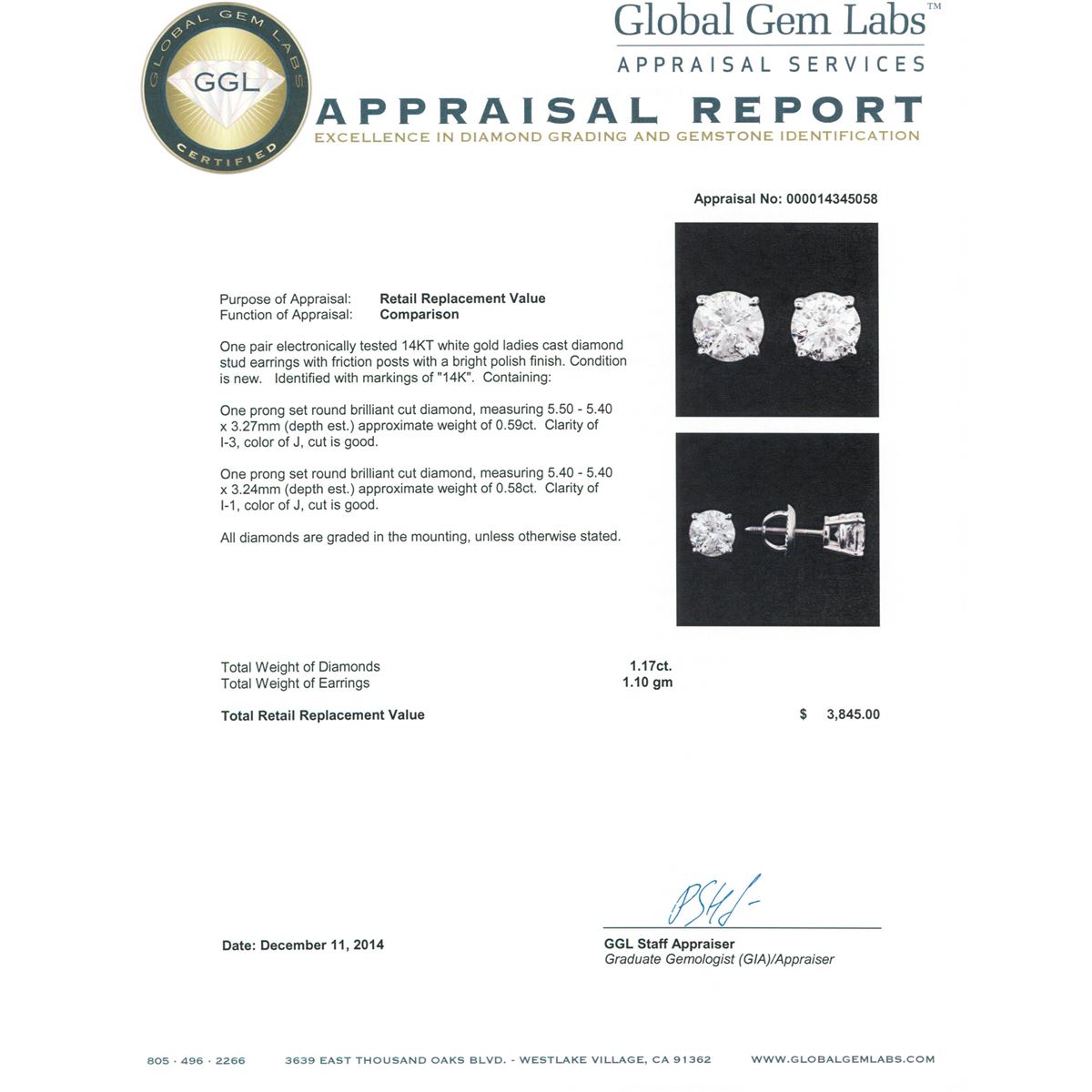 One pair electronically tested 14KT white gold ladies cast diamond stud earrings with friction posts with a bright polish finish. Identified with markings of "14K". Condition is new. Containing: One prong set round brilliant cut diamond, measuring 5.50 - 5.40 x 3.27mm (depth est.) approximate weight of 0.59ct. Clarity: I-3. Color: J, Cut is Good. One prong set round brilliant cut diamond, measuring 5.40 - 5.40 x 3.24mm (depth est.) approximate weight of 0.58ct. Clarity: I-1. Color: J, Cut is Good. All diamonds are graded in the mounting, unless otherwise stated. Total Weight of Diamonds 1.17ct. Total Weight of Earrings 1.10 grams. GGL Appraised at $3,845.00.