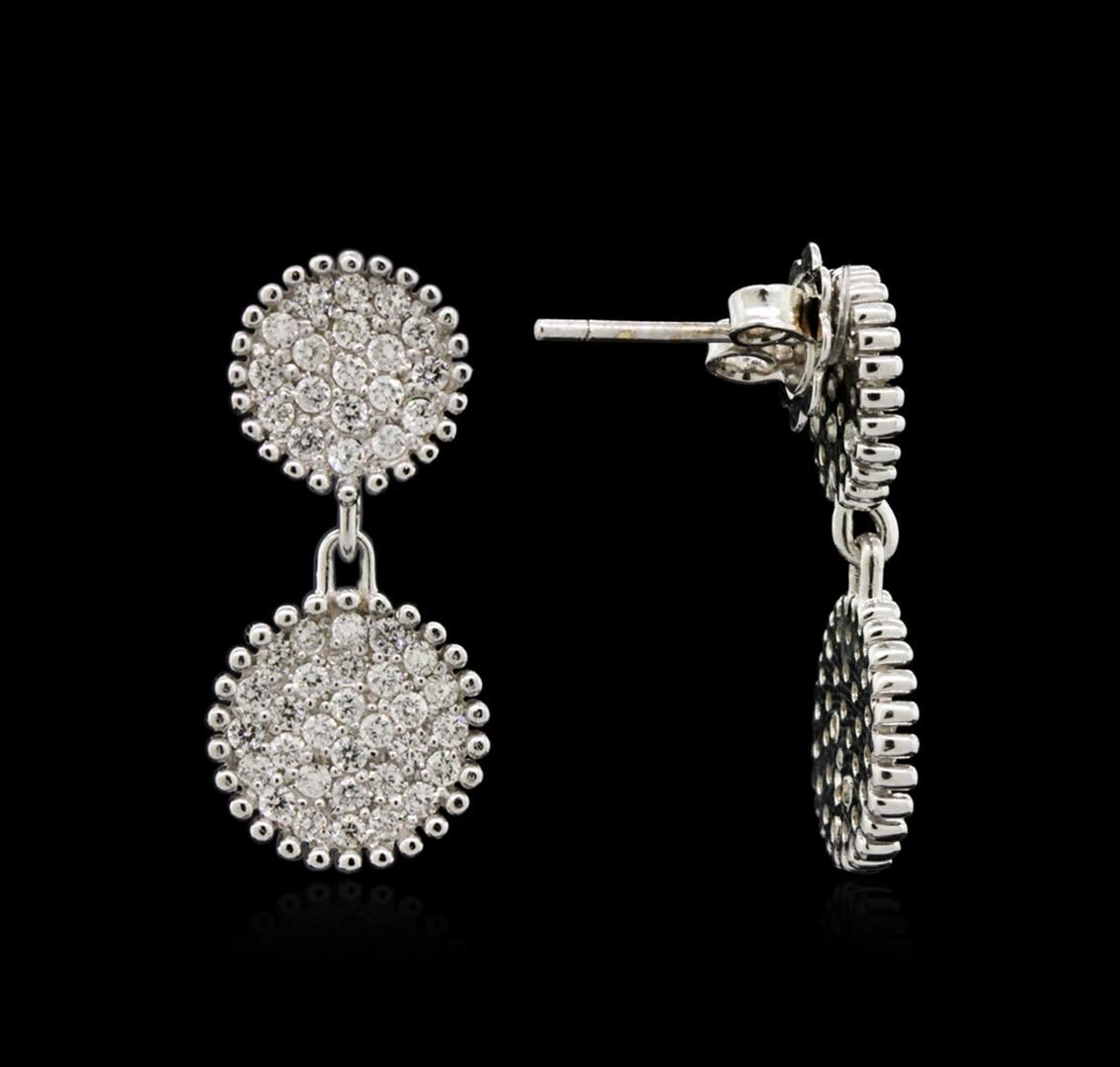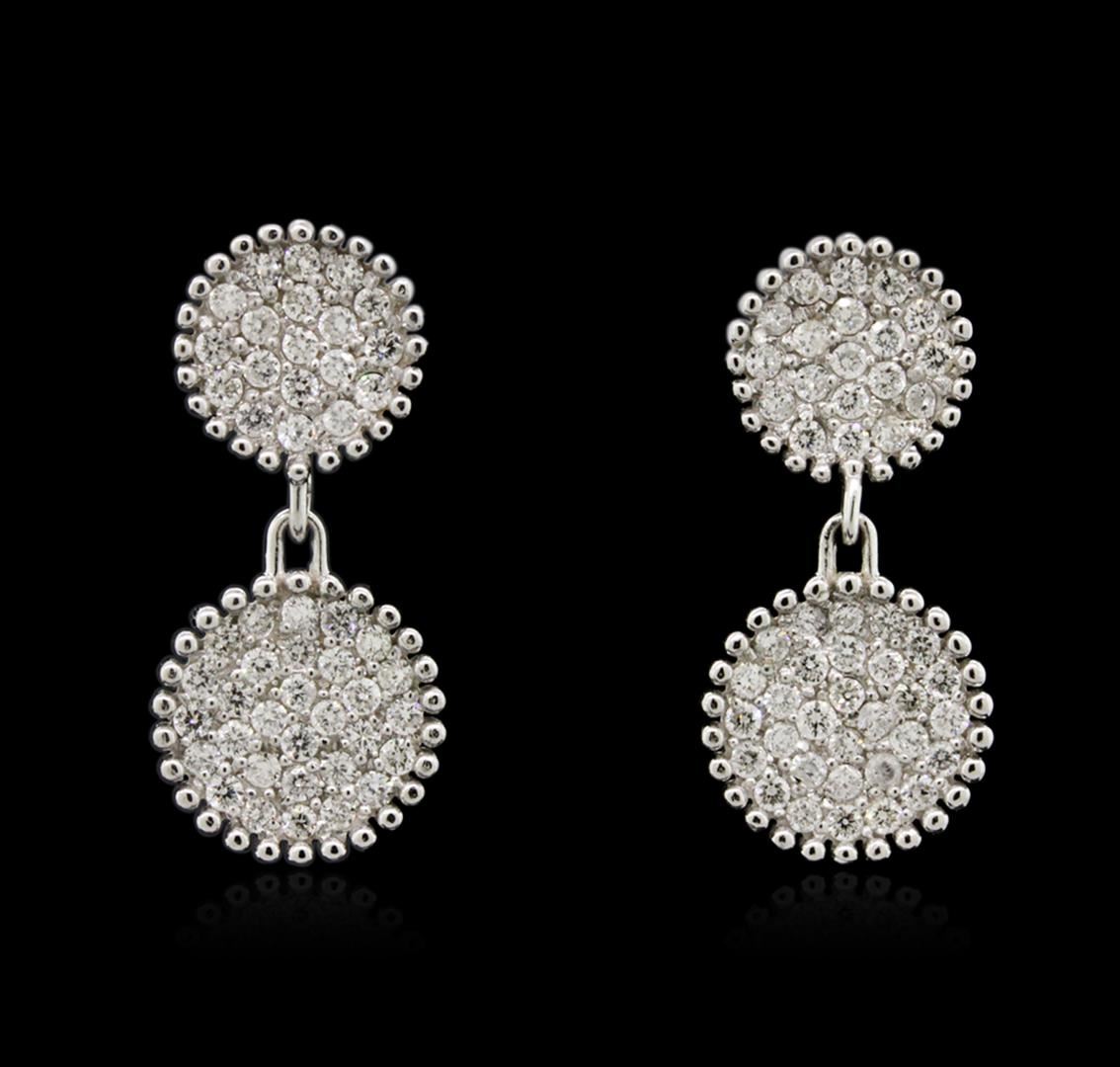 One pair electronically tested 14KT white gold ladies cast diamond earrings with friction posts with a bright polish finish. Identified with markings of "14K". Condition is new. Containing: Ninety-Six pave' set round brilliant cut diamonds, measuring 1.50 - 1.50 x 0.90mm (depth est.) approximate total weight of 96 Stones = 1.18ct. Clarity: SI-2 to I-1. Color: G - H. All diamonds are graded in the mounting, unless otherwise stated. Total Weight of Diamonds 1.18ct. Total Weight of Earrings 4.60 grams. GGL Appraised at $2,990.00.