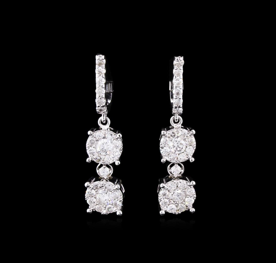 One pair electronically tested 14KT white gold ladies combination cast & assembled diamond dangle earrings with lever backs with a bright polish finish. Condition is new. Containing: Four prong set round brilliant cut diamonds, measuring 3.50 - 3.50 x 2.10mm (depth est.) approximate total weight of 4 Stones = 0.63ct. Clarity: SI-1 to SI-2. Color: J - K, Cut is Good. Forty-Six prong set round brilliant cut diamonds, measuring 1.50 - 1.50 x 0.90mm (depth est.) approximate total weight of 46 Stones = 0.57ct. Clarity: SI-2 to I-1. Color: I - J, Cut is Good. All diamonds are graded in the mounting, unless otherwise stated. Total Weight of Diamonds 1.19ct. Total Weight of Earrings 5.30 grams. GGL Appraised at $4,275.00.