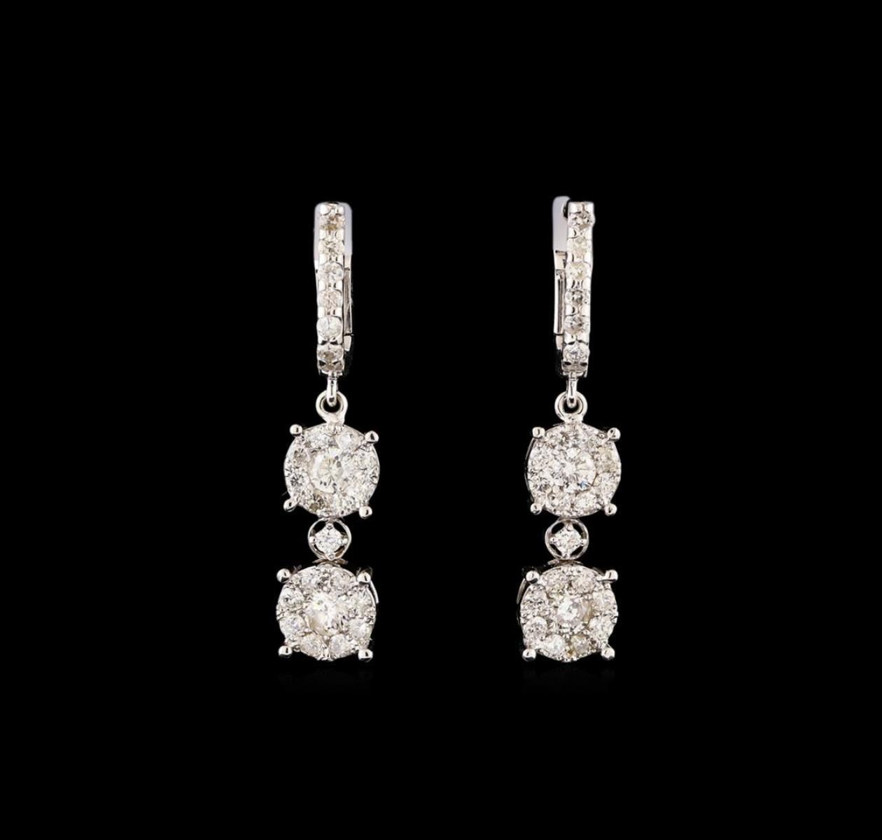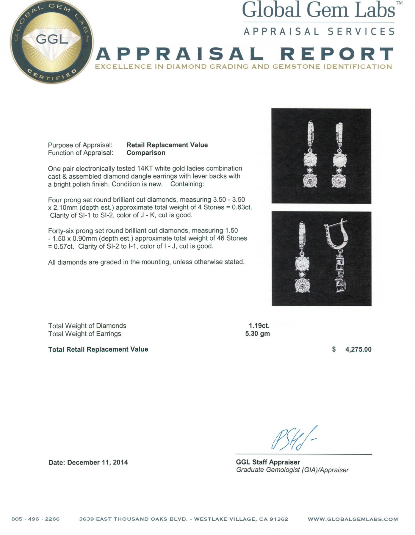 One pair electronically tested 14KT white gold ladies combination cast & assembled diamond dangle earrings with lever backs with a bright polish finish. Condition is new. Containing: Four prong set round brilliant cut diamonds, measuring 3.50 - 3.50 x 2.10mm (depth est.) approximate total weight of 4 Stones = 0.63ct. Clarity: SI-1 to SI-2. Color: J - K, Cut is Good. Forty-Six prong set round brilliant cut diamonds, measuring 1.50 - 1.50 x 0.90mm (depth est.) approximate total weight of 46 Stones = 0.57ct. Clarity: SI-2 to I-1. Color: I - J, Cut is Good. All diamonds are graded in the mounting, unless otherwise stated. Total Weight of Diamonds 1.19ct. Total Weight of Earrings 5.30 grams. GGL Appraised.