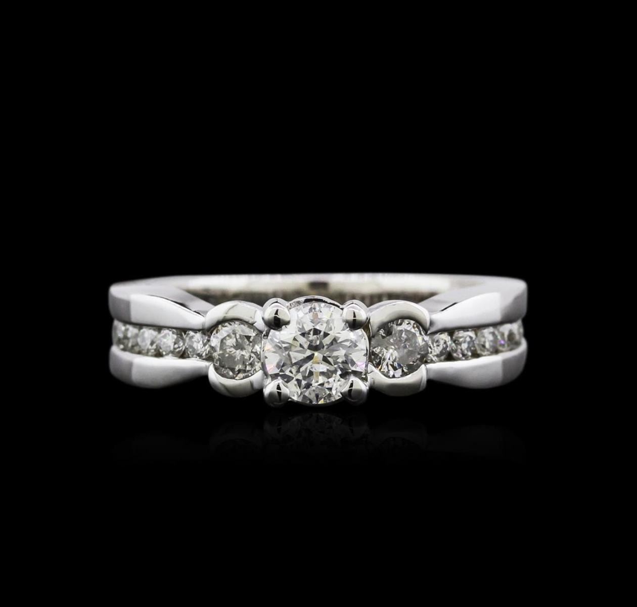 One electronically tested 14KT white gold ladies cast diamond ring with a bright polish finish. Identified with markings of "14K". Condition is new. Containing: One prong set round brilliant cut diamond, measuring 5.20 - 5.20 x 3.12mm (depth est.) approximate weight of 0.57ct. Clarity: I-1. Color: I, Cut is Good. Two half bezel set round brilliant cut diamonds, measuring 3.00 - 3.00 x 1.80mm (depth est.) approximate total weight of 2 Stones = 0.27ct. Clarity: I-1 to I-2. Color: I - J, Cut is Good. Fourteen prong set round brilliant cut diamonds, measuring 1.90 - 1.90 x 1.14mm (depth est.) approximate total weight of 14 Stones = 0.35ct. Clarity: I-1 to I-2. Color: I - J, Cut is Good. Diamonds are graded in the mounting, unless otherwise stated. Total Weight of Diamonds 1.19ct. Total Weight of Ring 6.70 grams. GGL Appraised.