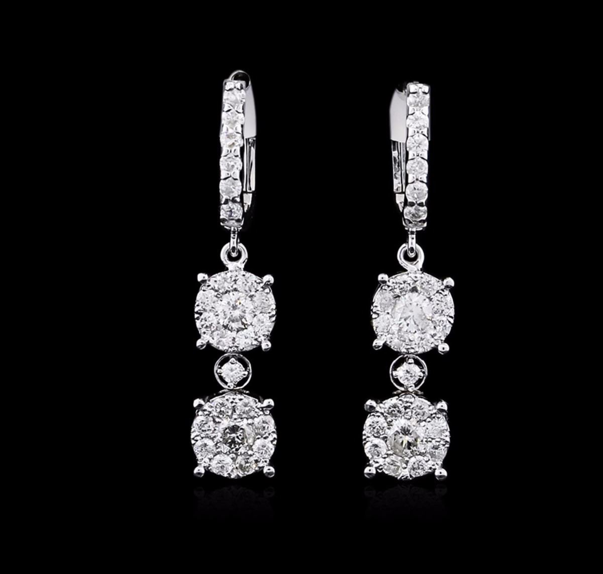 One pair electronically tested 14KT white gold ladies combination cast & assembled diamond dangle earrings with lever backs with a bright polish finish. Condition is new. Containing: Four prong set round brilliant cut diamonds, measuring 3.50 - 3.50 x 2.10mm (depth est.) approximate total weight of 4 Stones = 0.63ct. Clarity: SI-1 to SI-2. Color: J - K, Cut is Good. Forty-Six prong set round brilliant cut diamonds, measuring 1.50 - 1.50 x 0.90mm (depth est.) approximate total weight of 46 Stones = 0.57ct. Clarity: SI-2 to I-1. Color: I - J, Cut is Good. All diamonds are graded in the mounting, unless otherwise stated. Total Weight of Diamonds 1.19ct. Total Weight of Earrings 5.30 grams. GGL Appraised at $4,275.00.