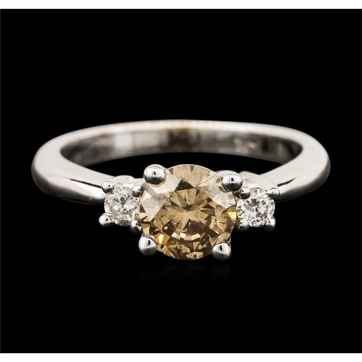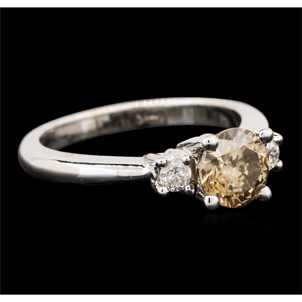 One electronically tested 14KT white gold ladies cast diamond ring with a bright polish finish. The featured diamond is accented by a single diamond on either side, completed by a two millimeter wide band. Identified with markings of "14K". Condition is new, good workmanship. Containing: One prong set round brilliant cut diamond, measuring 6.40 - 6.35 x 3.60mm (depth est.), 6.00.%. GTCF approximate weight of 1.04ct with a faint blue fluorescence. Graded in the setting. Clarity: I-1. Depth: 56.4%. Table 60.3%. Two prong set round brilliant cut diamonds, measuring 2.60 - 2.50 x 1.53mm (depth est.) approximate total weight of 2 Stones = 0.15ct. Graded in the setting. Clarity: SI-2 to I-1. Color: G - H. Total Weight of Diamonds 1.19ct. Total Weight of Ring 4.09 grams. AIG Appraised at $8,000.00.