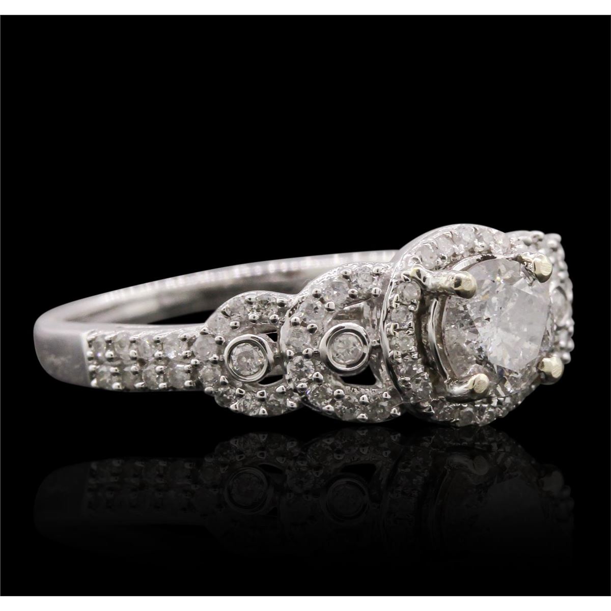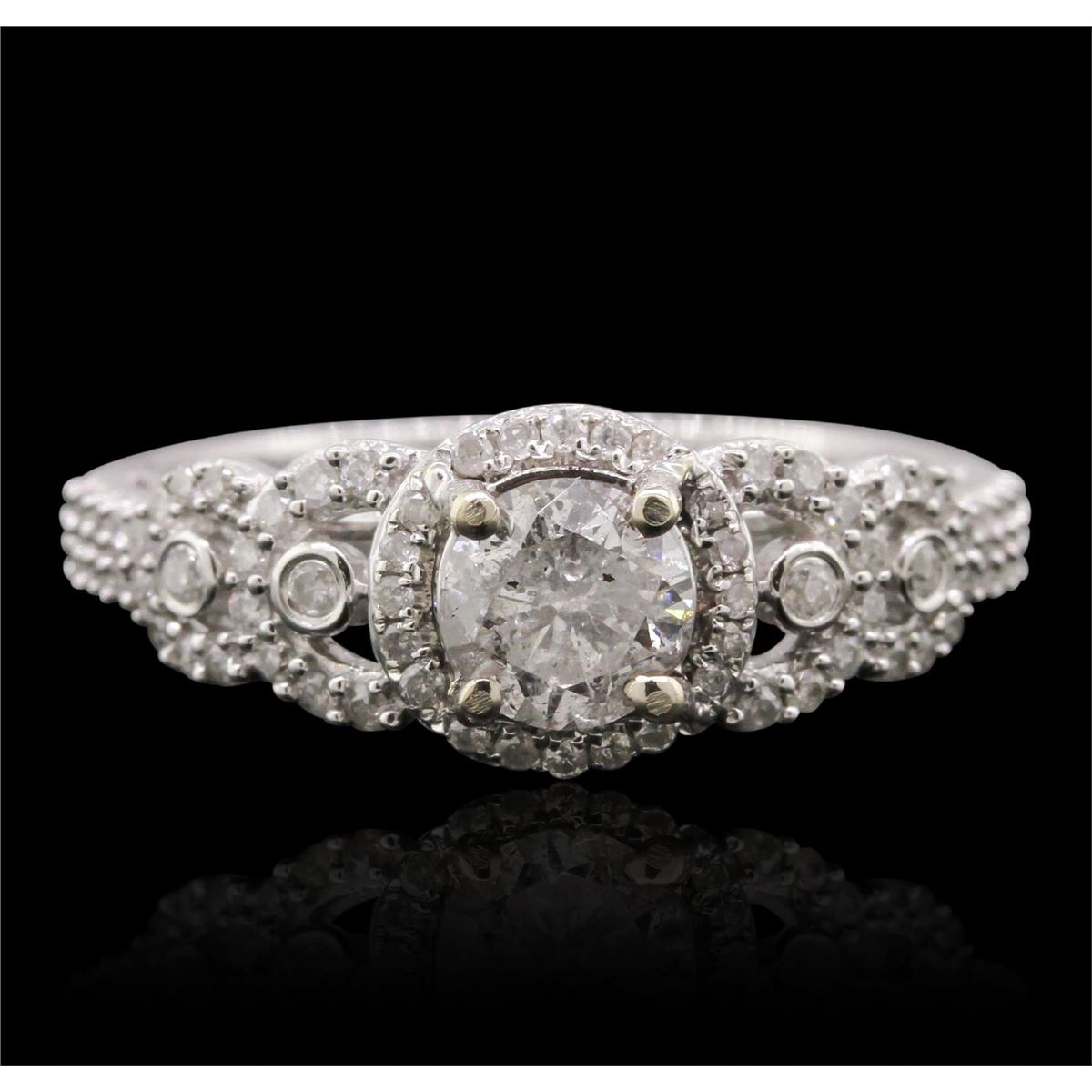 One electronically tested 14KT white gold ladies cast diamond unity ring with a bright polish finish. The featured diamond is set within a diamond bezel supported by elaborate diamond set shoulders, completed by a one and one-half millimeter wide band. Trademark is Orianne. Identified with markings of "14K". Condition is new, good workmanship. Containing: One prong set round brilliant cut diamond, measuring 5.40 - 5.35 x 3.40mm (depth est.) approximate weight of 0.70ct with a faint blue fluorescence. Graded in the setting. Clarity: I-1 . Color: HDepth 63.2%. Table 62.3%. Seventy-Two prong and bezel set round brilliant cut diamonds, measuring 1.20 - 1.10 x 0.69mm (depth est.) approximate. Total Weight of 72 Stones = 0.49ct. Graded in the setting. Clarity: I-1 to I-2 . Color: H - J. Total Weight of Diamonds 1.19ct. Total Weight of Ring 4.31gm. AIG Appraised at $8,810.00.