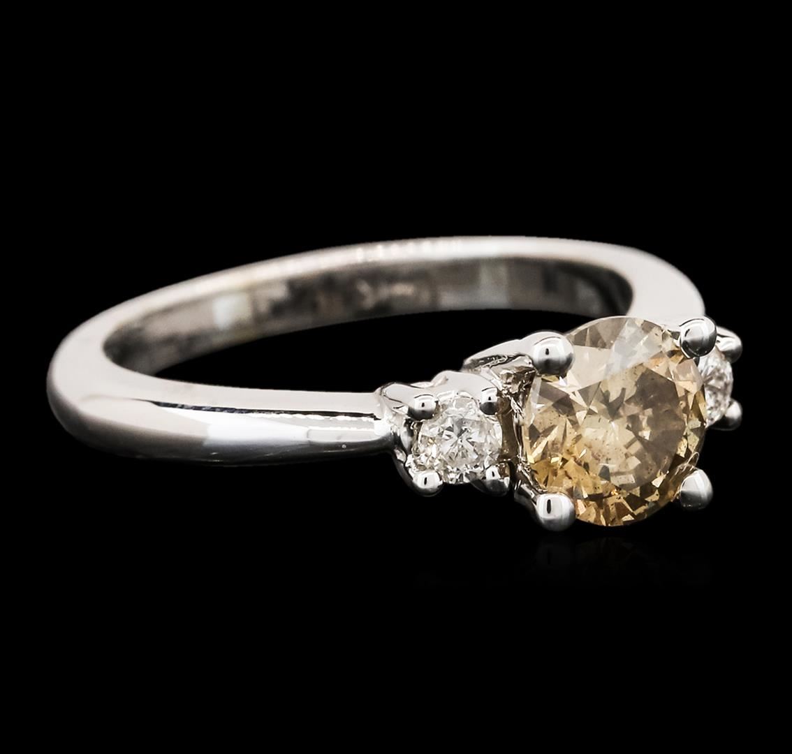 One electronically tested 14KT white gold ladies cast diamond ring with a bright polish finish. The featured diamond is accented by a single diamond on either side, completed by a two millimeter wide band. Identified with markings of "14K". Condition is new, good workmanship. Containing: One prong set round brilliant cut diamond, measuring 6.40 - 6.35 x 3.60mm (depth est.), 6.00.%. GTCF approximate weight of 1.04ct with a faint blue fluorescence. Graded in the setting. Clarity: I-1. Depth: 56.4%. Table 60.3%. Two prong set round brilliant cut diamonds, measuring 2.60 - 2.50 x 1.53mm (depth est.) approximate total weight of 2 Stones = 0.15ct. Graded in the setting. Clarity: SI-2 to I-1. Color: G - H. Total Weight of Diamonds 1.19ct. Total Weight of Ring 4.09 grams. AIG Appraised at $8,000.00.