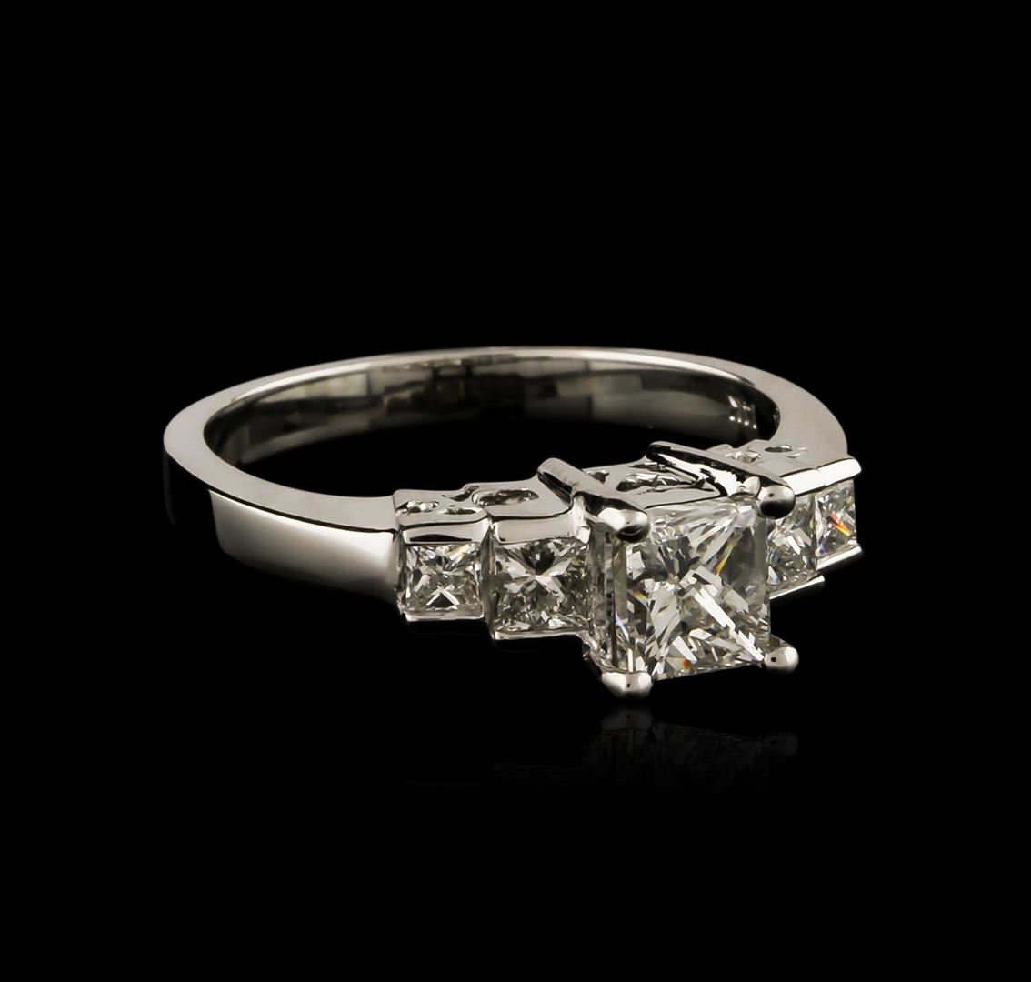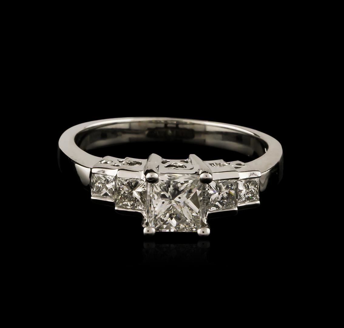 One electronically tested 14KT white gold ladies cast diamond engagement ring with a bright polish finish. Identified with markings of "14K". Condition is new. Containing: One prong set princess cut diamond, measuring 4.90 x 4.90 x 3.68mm (depth est.) approximate weight of 0.73ct. Clarity: SI-2. Color: J. Four prong set princess cut diamonds, measuring 3.00 x 2.50 x 1.88mm (depth est.) approximate total weight of 4 Stones = 0.46ct. Clarity: SI-1. Color: I, Cut is Good. All diamonds are graded in the mounting, unless otherwise stated. Total Weight of Diamonds 1.19ct. Total Weight of Engagement Ring 3.40 grams. GGL Appraised at $5,830.00.