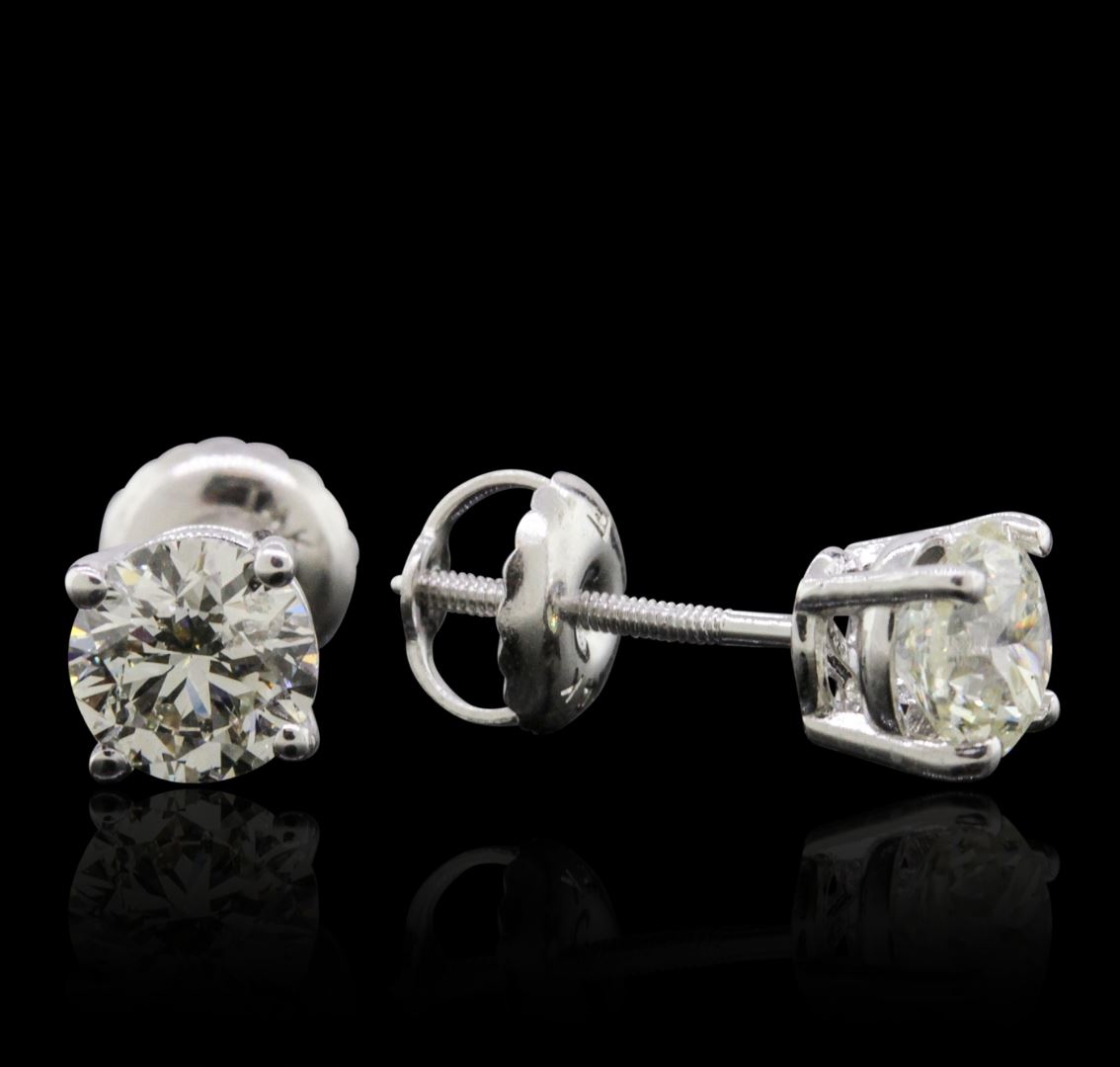 One pair electronically tested 14KT white gold cast & assembled diamond solitaire earrings with screw backs. Bright polish finish. Condition is new, good workmanship. Containing: One prong set round brilliant cut diamond, measuring 5.01 - 5.00 x 3.20mm (depth est.), 3.00% GTCF approximate weight of 0.60ct with a faint blue fluorescence. Graded in the setting. Clarity: I-1. Color: 63.9%. Table 59.9%. One prong set round brilliant cut diamond, measuring 5.00 - 4.90 x 3.20mm (depth est.), 3.00% GTCF approximate weight of 0.59ct with a medium blue fluorescence. Graded in the setting. Clarity: I-1. Color: 64.7%. Table 60.6%. Total Weight of Diamonds 1.19ct. Total Weight of Earrings 0.95 grams. AIG Appraised at $4,265.00.