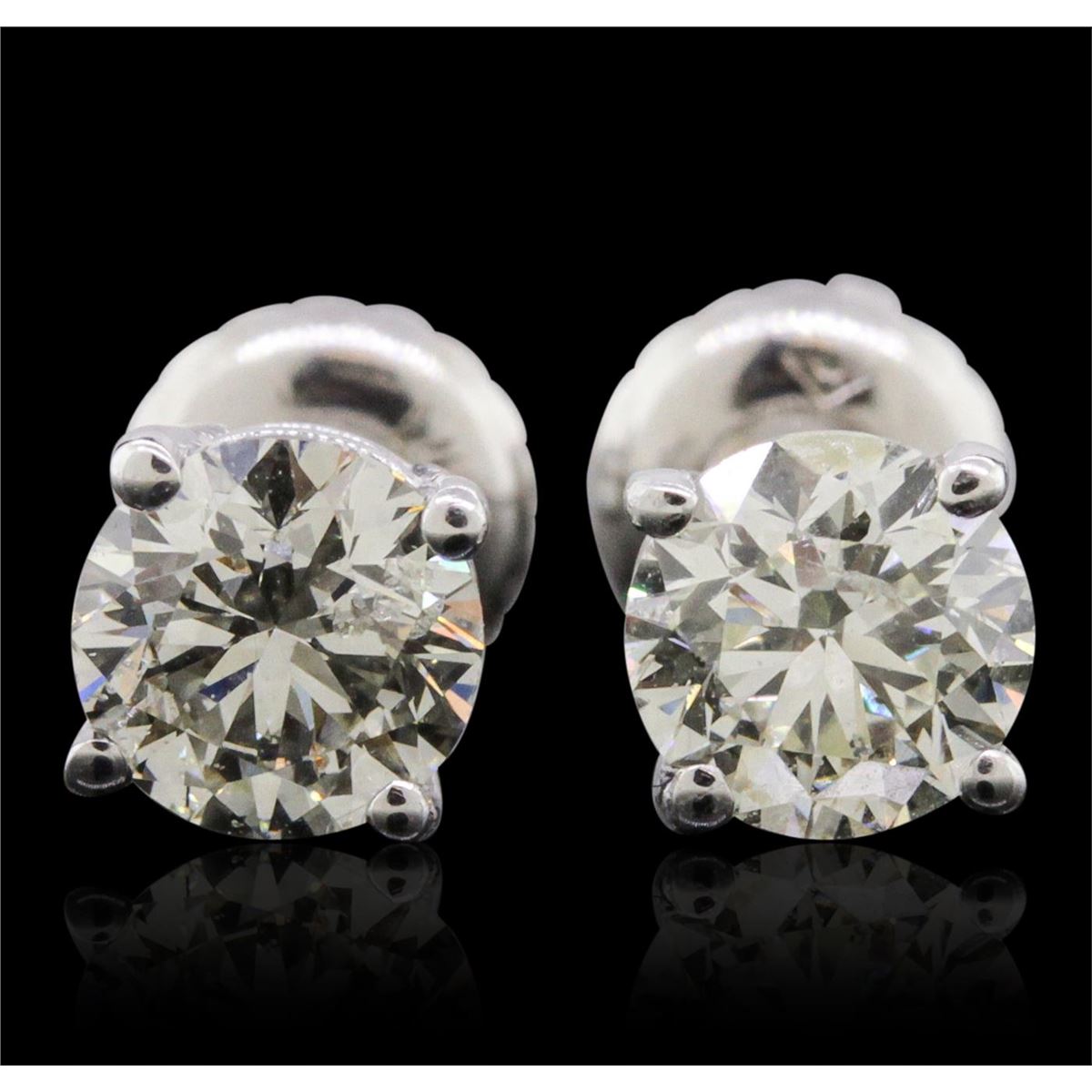 One pair electronically tested 14KT white gold cast & assembled diamond solitaire earrings with screw backs. Bright polish finish. Condition is new, good workmanship. Containing: One prong set round brilliant cut diamond, measuring 5.01 - 5.00 x 3.20mm (depth est.), 3.00% GTCF approximate weight of 0.60ct with a faint blue fluorescence. Graded in the setting. Clarity: I-1. Color: 63.9%. Table 59.9%. One prong set round brilliant cut diamond, measuring 5.00 - 4.90 x 3.20mm (depth est.), 3.00% GTCF approximate weight of 0.59ct with a medium blue fluorescence. Graded in the setting. Clarity: I-1. Color: 64.7%. Table 60.6%. Total Weight of Diamonds 1.19ct. Total Weight of Earrings 0.95 grams. AIG Appraised at $4,265.00.