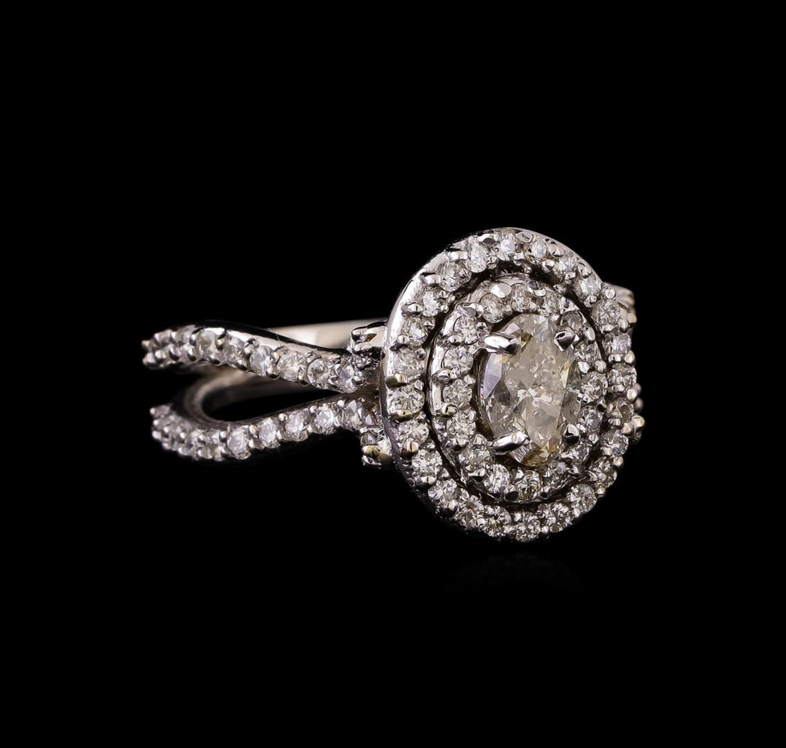 One electronically tested 14KT white gold ladies cast diamond engagement ring with a bright polish finish. Identified with markings of "K14". Condition is new. Containing: One prong set round brilliant cut diamond, measuring 6.60 - 4.30 x 3.27mm (depth est.) approximate weight of 0.59ct. Clarity: I-1. Color: J, Cut is Good. Seventy-Six prong set round brilliant cut diamonds, measuring 1.30 - 1.30 x 0.78mm (depth est.) approximate total weight of 76 Stones = 0.61ct. Clarity: SI-2 to I-2. Color: H - I, Cut is Good. All diamonds are graded in the mounting, unless otherwise stated. Total Weight of Diamonds 1.20 ct. Total Weight of Ring 8.00 grams. GGL Appraised.