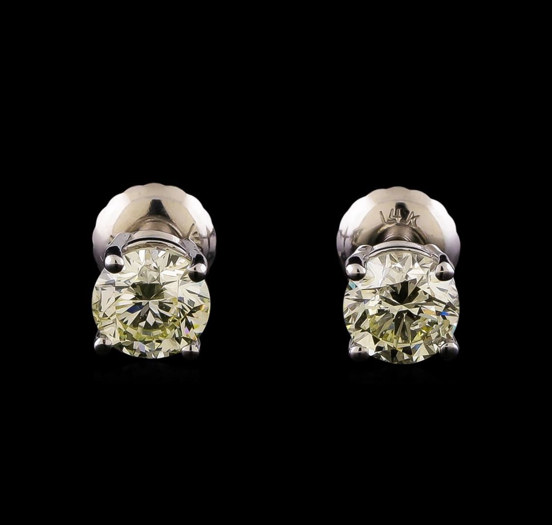 One pair electronically tested 14KT white gold cast & assembled diamond solitaire earrings with screw backs. Bright polish finish. Condition is new, good workmanship. Containing: One prong set round brilliant cut diamond, measuring 5.02 - 5.01 x 3.40mm (depth est.), 3.00% GTCF approximate weight of 0.63ct with a medium blue fluorescence. Graded in the setting. Clarity: I-1. Depth: 67.7%. Table 59.8%. One prong set round brilliant cut diamond, measuring 4.90 - 4.80 x 3.20mm (depth est.), 3.00% GTCF approximate weight of 0.57ct. Graded in the setting. Clarity: I-1. Depth: 66.0%. Table 67.0%. Total Weight of Diamonds 1.20ct. Total Weight of Earrings 0.93 grams. AIG Appraised at $3,895.00.