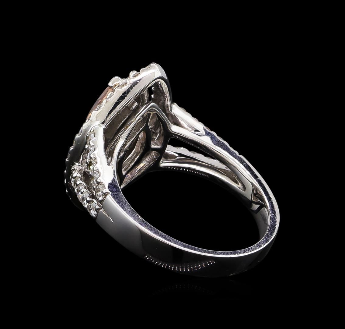 One electronically tested 14KT white gold Ladies combination cast & assembled ring with a bright polish finish. Condition is new. Identified with markings of "14K". Containing: Sixty-Six prong set round brilliant cut diamonds, measuring 1.70 - 1.70 x 1.02mm (depth est.) approximate. Total Weight of 66 Stones = 1.24ct. Clarity: I-1 to I-2. Color: H - J, Cut is Good. One prong set marquise modified brilliant cut natural morganite, measuring 11.00 x 5.00 x 3.25mm, approximate weight of 1.20ct., clarity is eye clean, type I, light, brownish, reddish orange color, (GIA rO 3/1), cut is very good. Colored gemstones are presumed to have been subjected to commonly used color/clarity enhancement processes. Total Weight of Colored Stones 1.20ct. Total Weight of Diamonds 1.24ct. Total Weight of Ring 7.20 grams. GGL Appraised at $5,185.00.