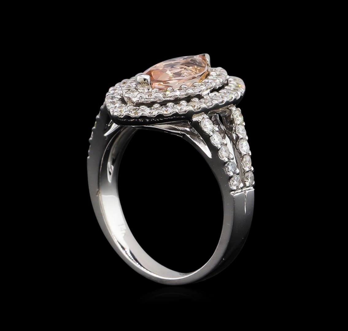 One electronically tested 14KT white gold Ladies combination cast & assembled ring with a bright polish finish. Condition is new. Identified with markings of "14K". Containing: Sixty-Six prong set round brilliant cut diamonds, measuring 1.70 - 1.70 x 1.02mm (depth est.) approximate. Total Weight of 66 Stones = 1.24ct. Clarity: I-1 to I-2. Color: H - J, Cut is Good. One prong set marquise modified brilliant cut natural morganite, measuring 11.00 x 5.00 x 3.25mm, approximate weight of 1.20 ct., clarity is eye clean, type I, light, brownish, reddish orange color, (GIA rO 3/1), cut is very good. Colored gemstones are presumed to have been subjected to commonly used color/clarity enhancement processes. Total Weight of Colored Stones 1.20 ct. Total Weight of Diamonds 1.24ct. Total Weight of Ring 7.20 grams. GGL Appraised.