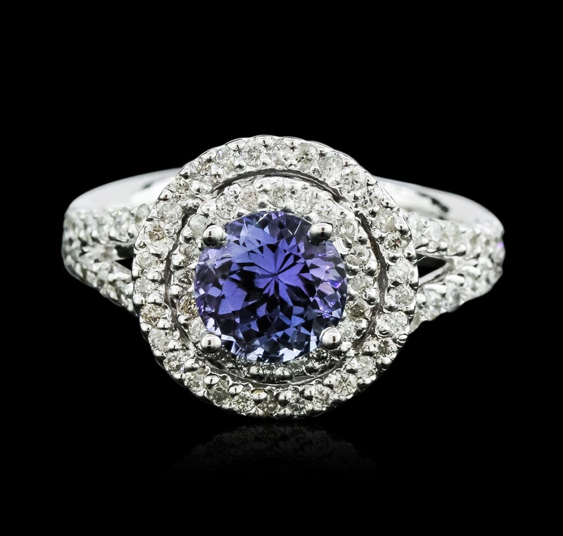 One electronically tested 14KT white gold ladies cast tanzanite and diamond ring with a bright polish finish. Identified with markings of "K14". Condition is new. Containing: One prong set round modified brilliant cut natural tanzanite, measuring 6.50 - 6.50 x 4.23 mm, approximate weight of 1.20ct., clarity is eye clean, type I, medium light, very slightly grayish, violet color, (GIA V 4/3), cut is good. Eighty prong set round brilliant cut diamonds, measuring 1.30 - 1.30 x 0.78mm (depth est.) approximate total weight of 80 Stones = 0.64ct. Clarity: SI-2 to I-2. Color: J, Cut is Good. Colored gemstones are presumed to have been subjected to commonly used enhancement processes. All diamonds and colored gemstones are graded in the mounting, unless otherwise stated. Total Weight of Colored Stones 1.20ct. Total Weight of Diamonds 0.64ct. Total Weight of Ring 5.50 grams. GGL Appraised at $3,800.00.