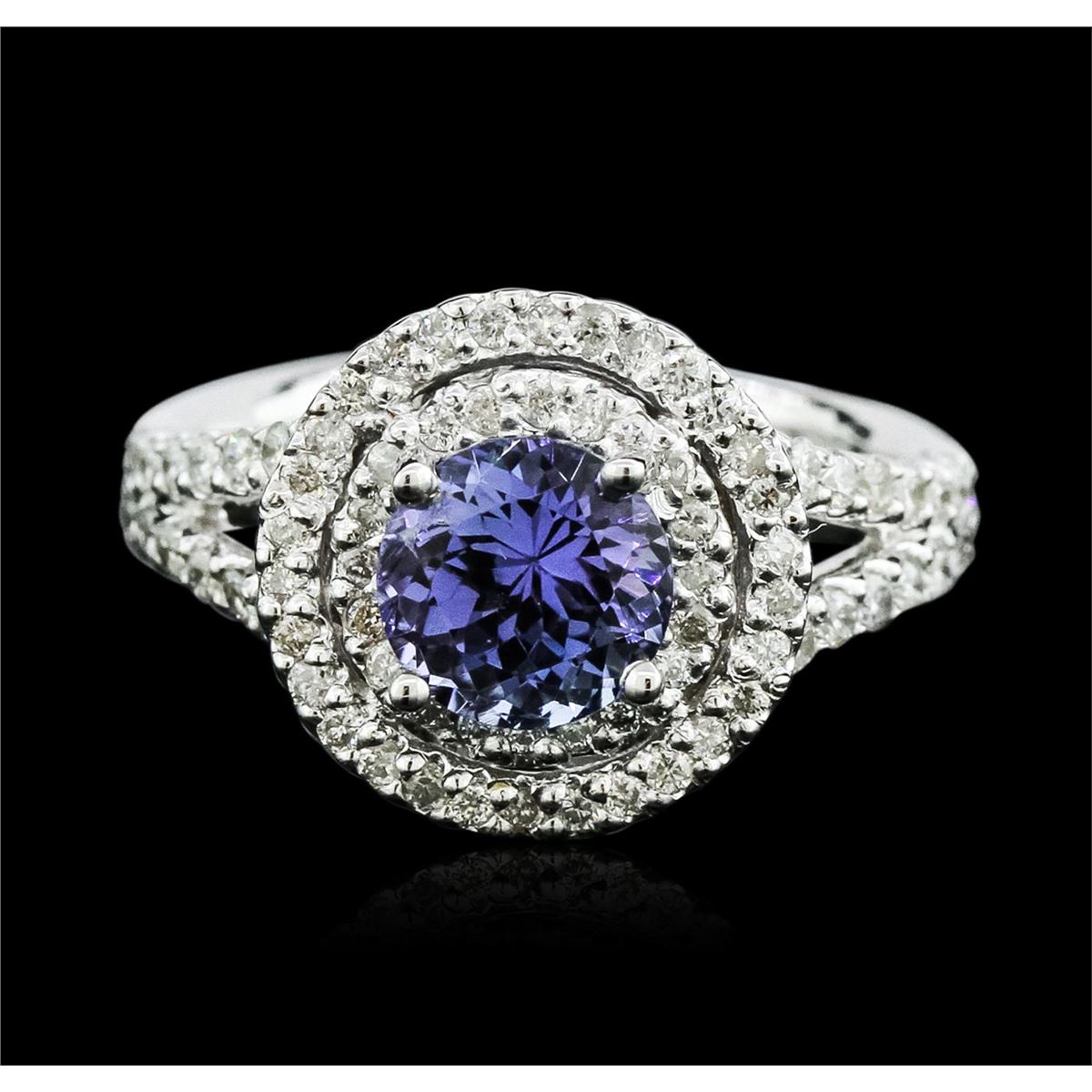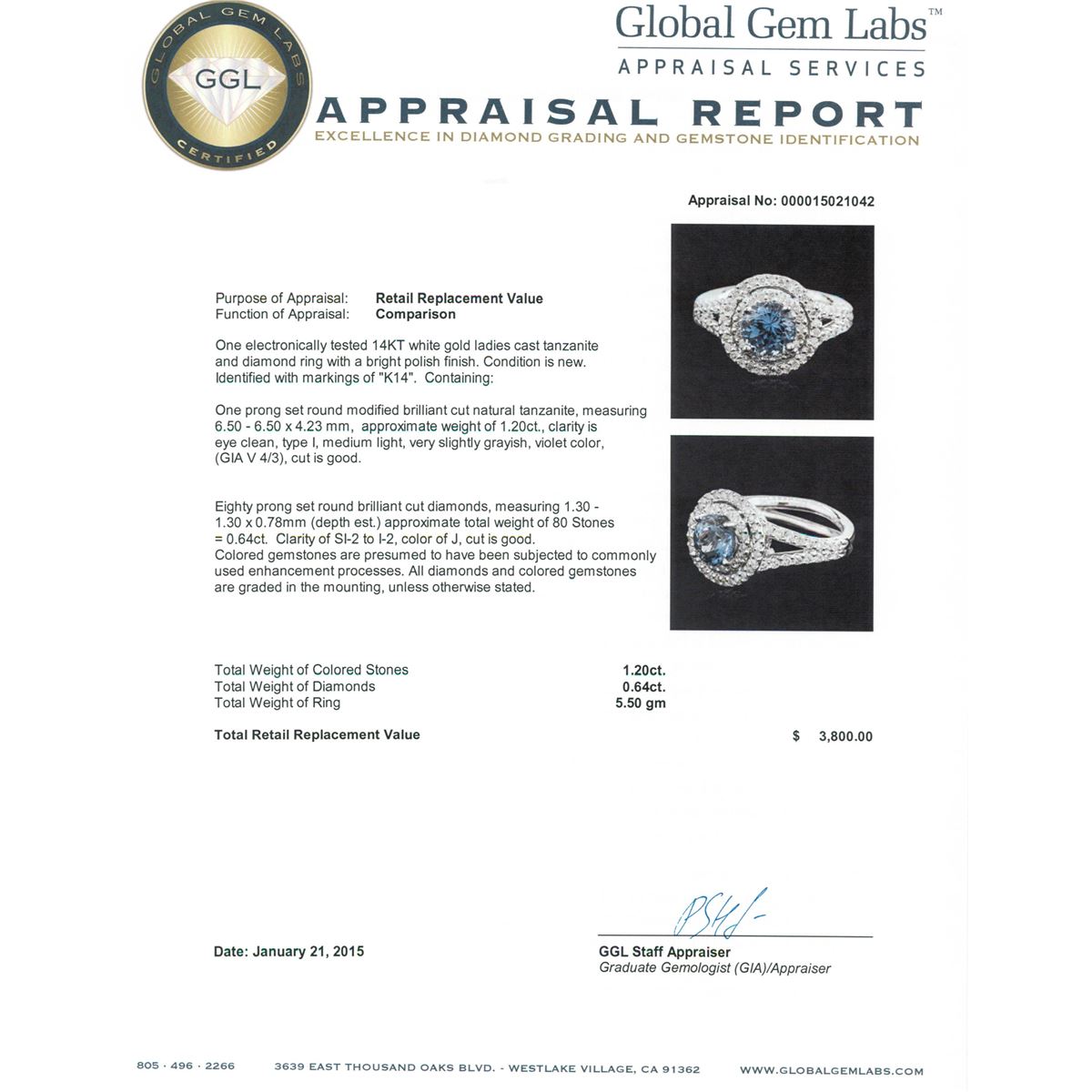 One electronically tested 14KT white gold ladies cast tanzanite and diamond ring with a bright polish finish. Identified with markings of "K14". Condition is new. Containing: One prong set round modified brilliant cut natural tanzanite, measuring 6.50 - 6.50 x 4.23 mm, approximate weight of 1.20ct., clarity is eye clean, type I, medium light, very slightly grayish, violet color, (GIA V 4/3), cut is good. Eighty prong set round brilliant cut diamonds, measuring 1.30 - 1.30 x 0.78mm (depth est.) approximate total weight of 80 Stones = 0.64ct. Clarity: SI-2 to I-2. Color: J, Cut is Good. Colored gemstones are presumed to have been subjected to commonly used enhancement processes. All diamonds and colored gemstones are graded in the mounting, unless otherwise stated. Total Weight of Colored Stones 1.20ct. Total Weight of Diamonds 0.64ct. Total Weight of Ring 5.50 grams. GGL Appraised at $3,800.00.