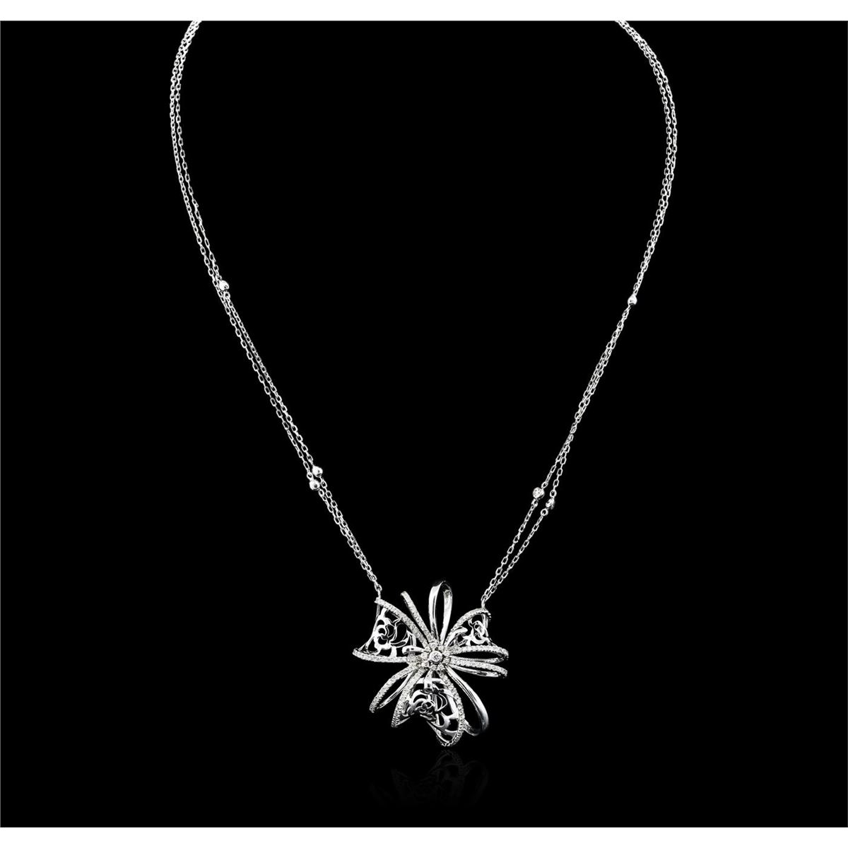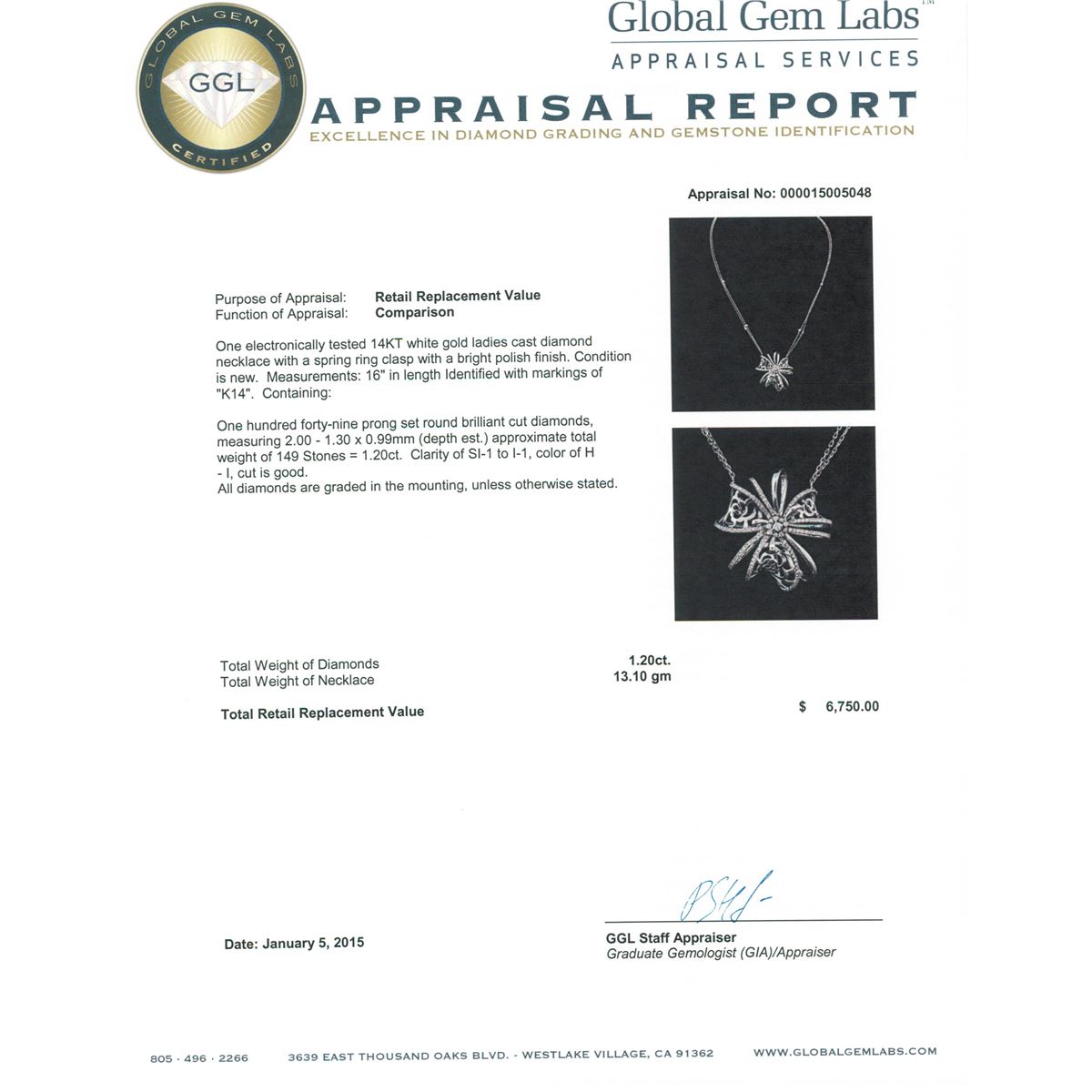 One electronically tested 14KT white gold ladies cast diamond necklace with a spring ring clasp with a bright polish finish. Measurements: 16" in length Identified with markings of "K14". Condition is new. Containing: One Hundred Forty-Nine prong set round brilliant cut diamonds, measuring 2.00 - 1.30 x 0.99mm (depth est.) approximate total weight of 149 Stones = 1.20ct. Clarity: SI-1 to I-1. Color: H - I, Cut is Good. All diamonds are graded in the mounting, unless otherwise stated. Total Weight of Diamonds 1.20ct. Total Weight of Necklace 13.10 grams. GGL Appraised at $6,750.00.