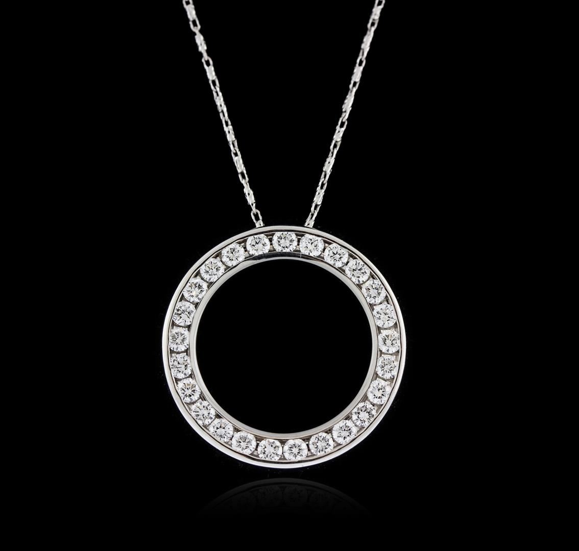 One circle pendant with chain featuring: 14KT white gold weighing 7.10 grams containing channel set round diamonds with a total weight of 1.20ct.