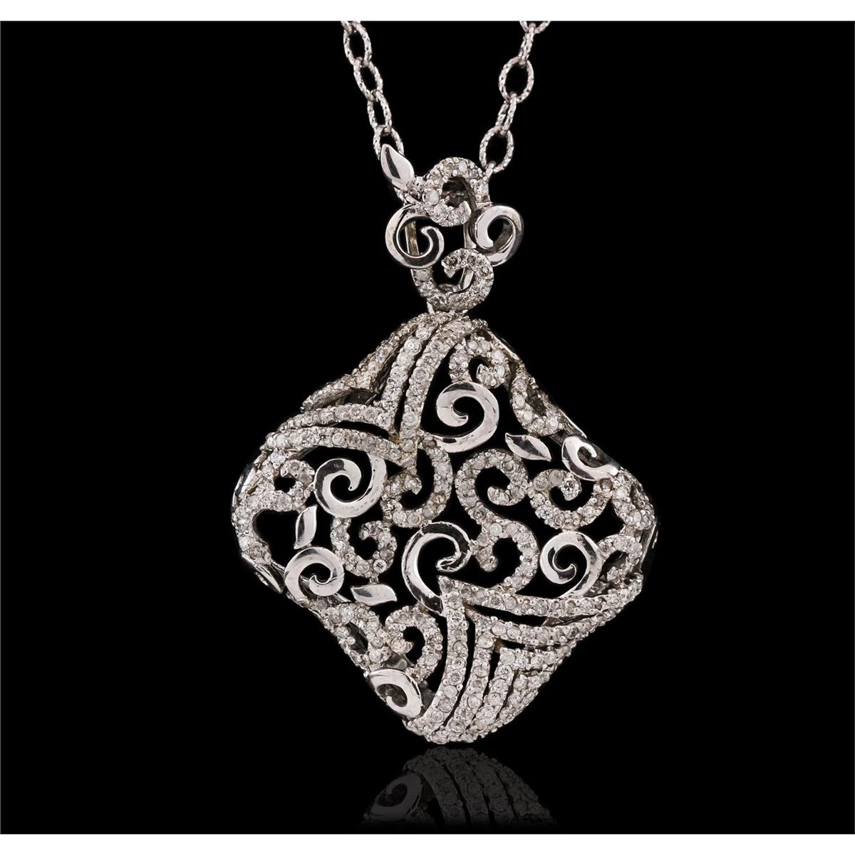 One electronically tested 14KT white gold ladies combination cast & assembled pendant & chain 17.0" long, light cable link with a lobster claw clasp with a bright polish finish. Identified with markings of "14K 585". Condition is new. Containing: Three Hundred Thirty-Three prong set round brilliant cut diamonds, measuring 1.00 - 1.00 x 0.60mm (depth est.) approximate total weight of 333 Stones = 1.20ct. Clarity: I-1 to I-3. Color: I - J, Cut is Good. All diamonds are graded in the mounting, unless otherwise stated. Total Weight of Diamonds 1.20ct. Total Weight of Pendant & Chain 12.60 grams. GGL Appraised at $8,490.00.