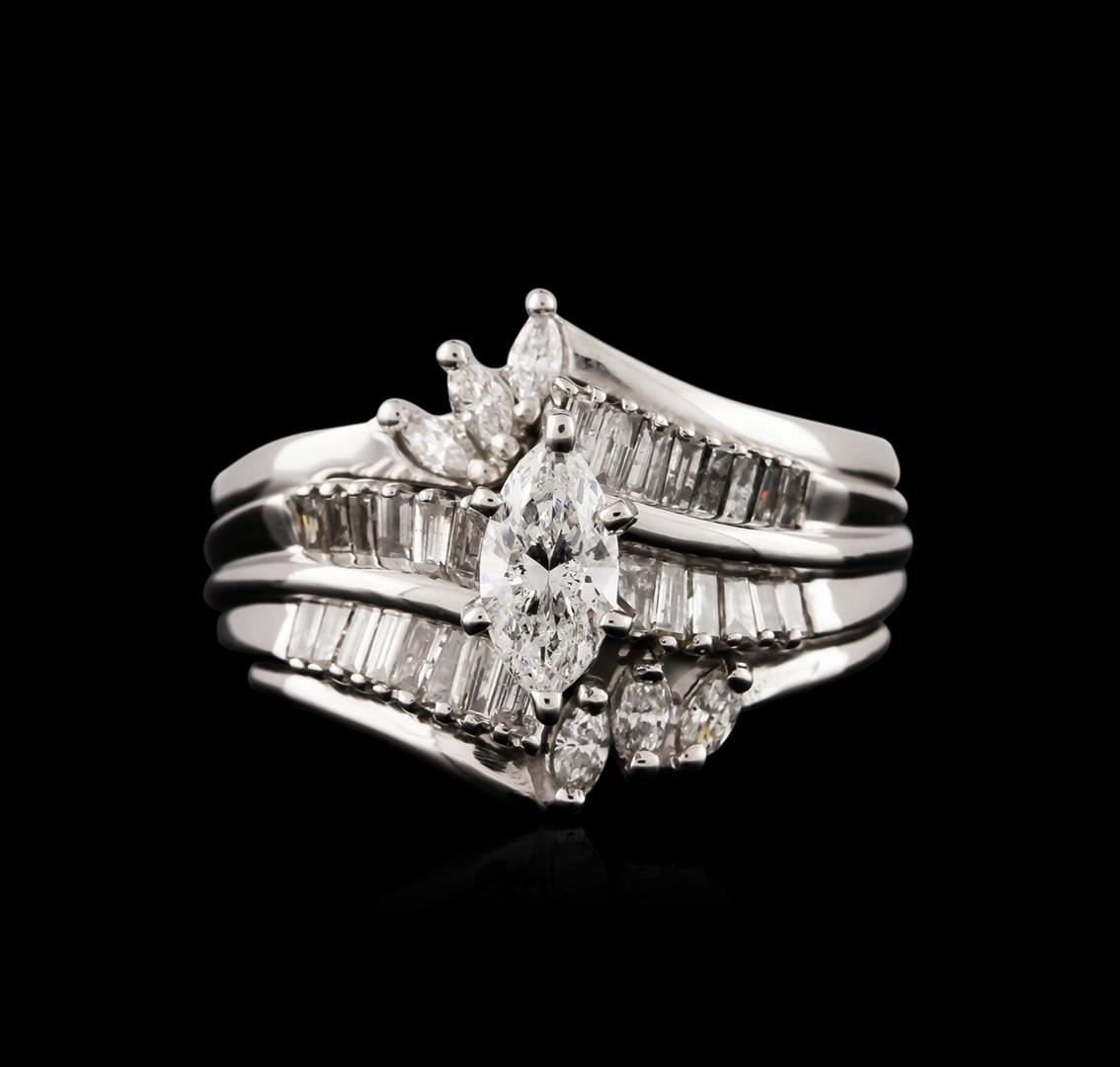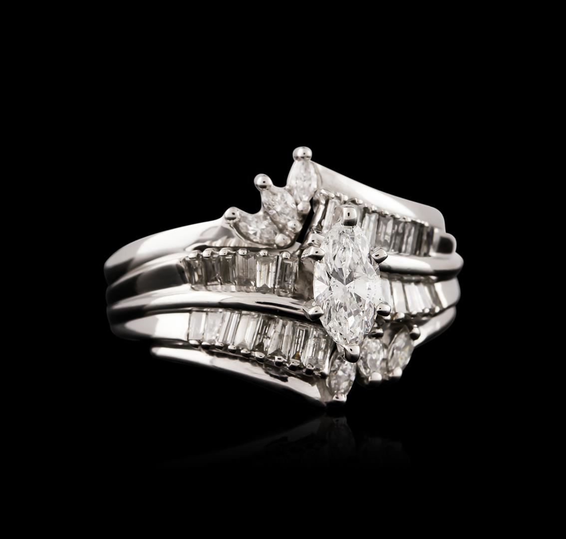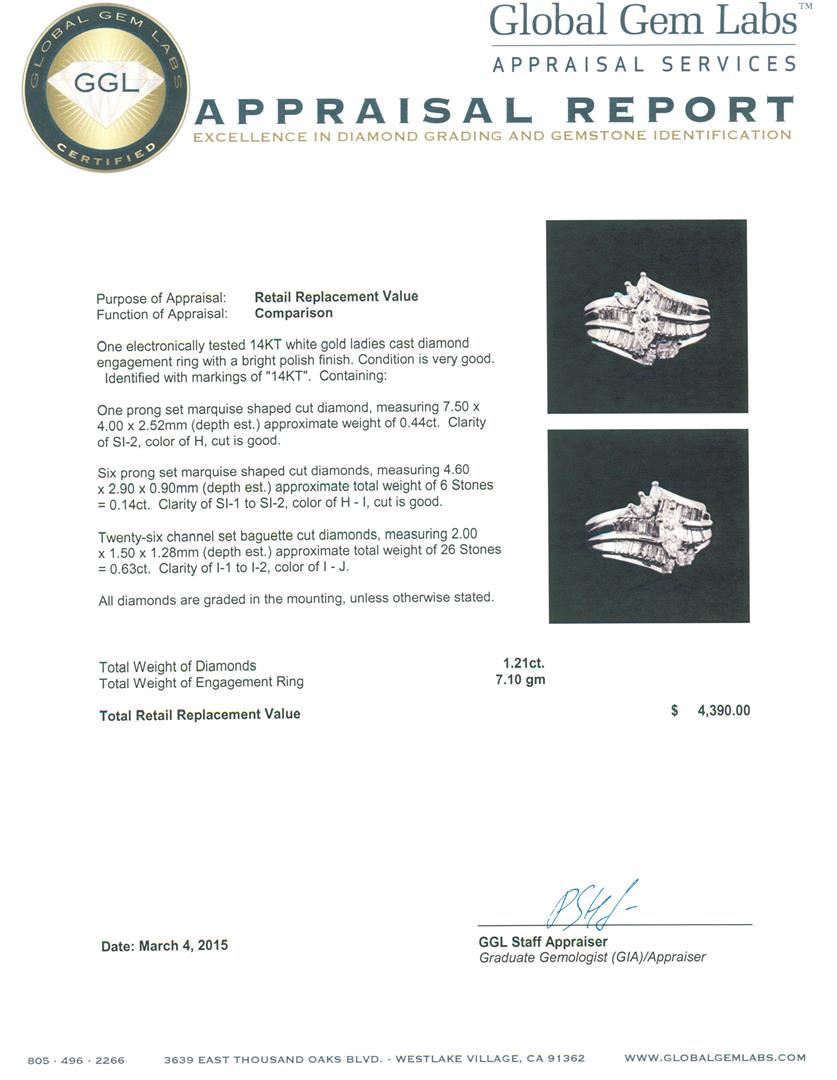 One electronically tested 14KT white gold ladies cast diamond engagement ring with a bright polish finish. Identified with markings of "14KT". Condition is very good. Containing: One prong set marquise shaped cut diamond, measuring 7.50 x 4.00. x 2.52mm (depth est.) approximate weight of 0.44ct. Clarity: SI-2. Color: H, Cut is Good. Six prong set marquise shaped cut diamonds, measuring 4.60 x 2.90 x 0.90mm (depth est.) approximate total weight of 6 Stones = 0.14ct. Clarity: SI-1 to SI-2. Color: H - I, Cut is Good. Twenty-Six channel set baguette cut diamonds, measuring 2.00. x 1.50 x 1.28mm (depth est.) approximate total weight of 26 Stones = 0.63ct. Clarity: I-1 to I-2. Color: I - J. All diamonds are graded in the mounting, unless otherwise stated. Total Weight of Diamonds 1.21ct. Total Weight of Engagement Ring 7.10 grams. GGL Appraised at $4,390.00.