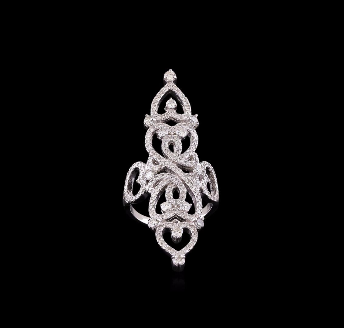 One electronically tested 14KT white gold ladies cast diamond ring with a bright polish finish. Identified with markings of "K14". Condition is new. Containing: Fourteen prong set round brilliant cut diamonds, measuring 2.00 - 2.20 x 1.26mm (depth est.) approximate total weight of 14 Stones = 0.48ct. Clarity: SI-2 to I-1. Color: J - K, Cut is Good. One Hundred Fifty-Two prong set round brilliant cut diamonds, measuring 1.10 - 1.10 x 0.66mm (depth est.) approximate total weight of 152 Stones = 0.73ct. Clarity: I-1 to I-2. Color: I - J, Cut is Good. All diamonds are graded in the mounting, unless otherwise stated. Total Weight of Diamonds 1.21ct. Total Weight of Ring 9.50 grams. GGL Appraised at $5,205.00.