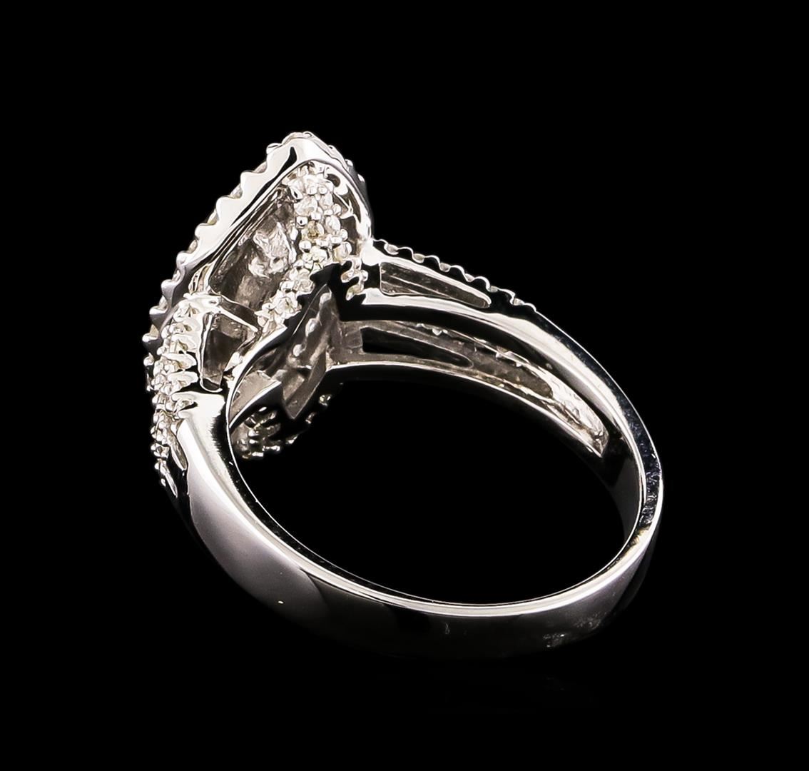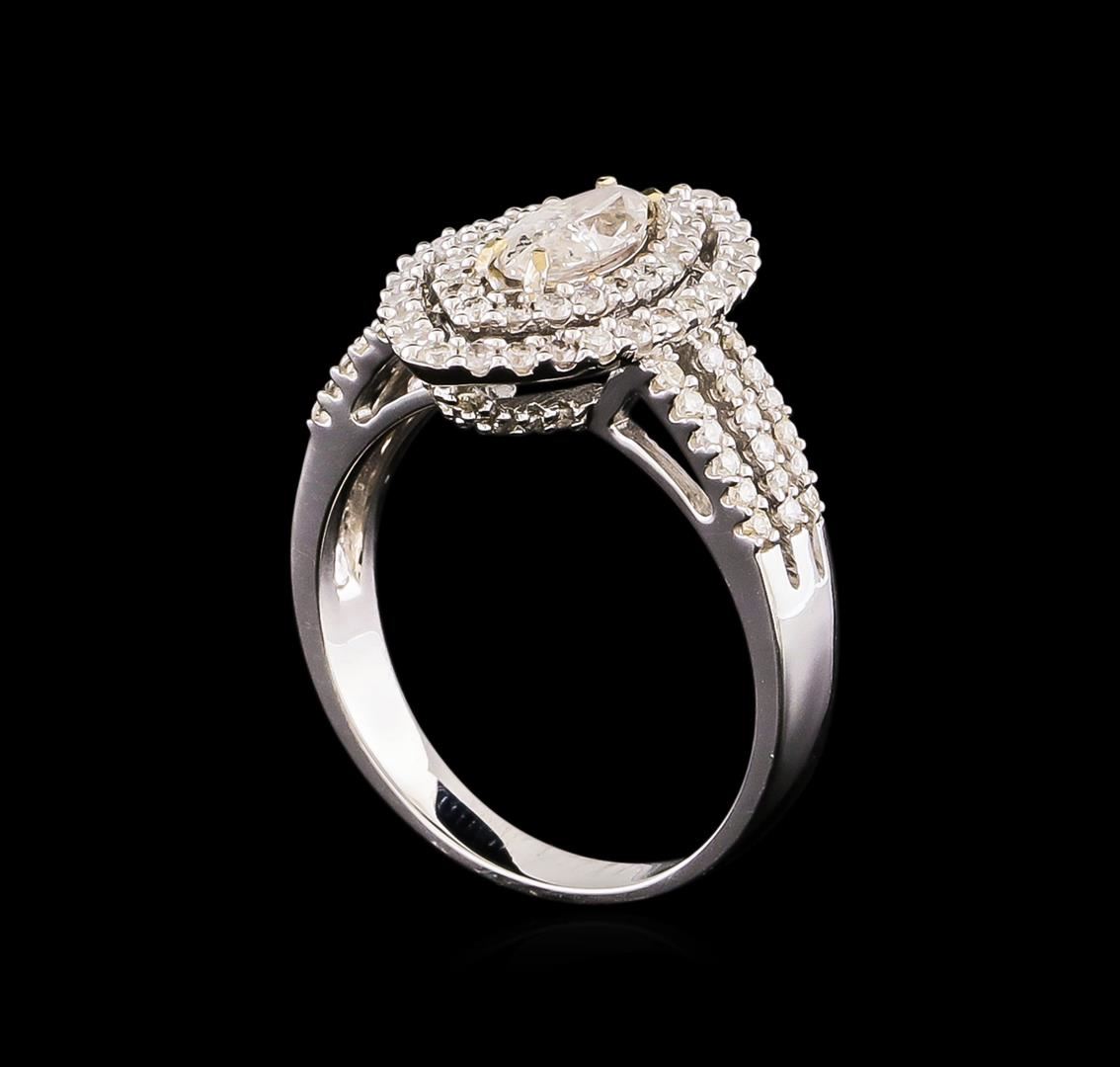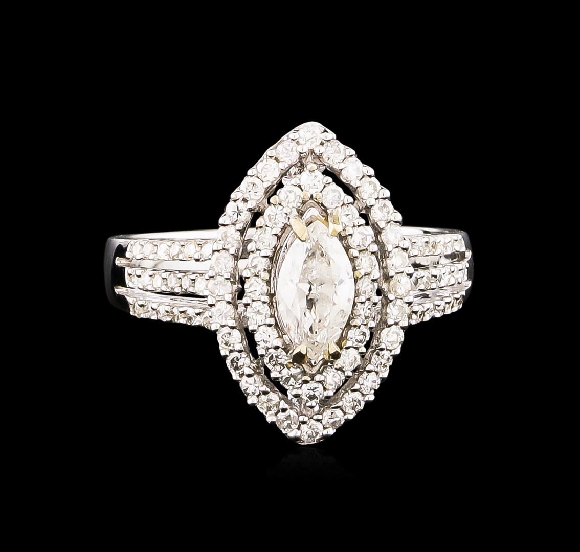 One electronically tested 14KT white gold Ladies combination cast & assembled engagement ring with a bright polish finish. Condition is new. Identified with markings of "14K". Containing: One prong set marquise shaped cut diamond, measuring 7.90 x 4.30 x 2.71mm (depth est.) approximate weight of 0.53ct. Clarity: I-2. Color: I, Cut is Good. Eighty-Four prong set round brilliant cut diamonds, measuring 1.30 - 1.30 x 0.78mm (depth est.) approximate. Total Weight of 84 Stones = 0.67ct. Clarity: I-1 to I-3. Color: H - I, Cut is Good. All grading of diamonds and colored gemstones in this piece of jewelry are graded in the mounting, unless otherwise stated. Total Weight of Diamonds 1.21ct. Total Weight of Engagement Ring 4.90 grams. GGL Appraised at $5,410.00.