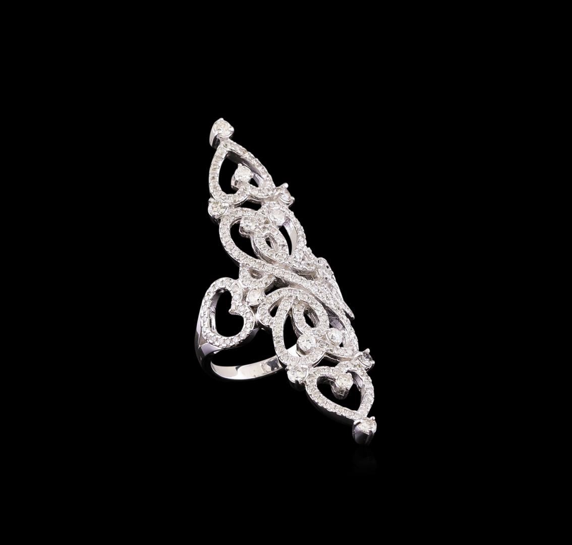 One electronically tested 14KT white gold ladies cast diamond ring with a bright polish finish. Identified with markings of "K14". Condition is new. Containing: Fourteen prong set round brilliant cut diamonds, measuring 2.00 - 2.20 x 1.26mm (depth est.) approximate total weight of 14 Stones = 0.48ct. Clarity: SI-2 to I-1. Color: J - K, Cut is Good. One Hundred Fifty-Two prong set round brilliant cut diamonds, measuring 1.10 - 1.10 x 0.66mm (depth est.) approximate total weight of 152 Stones = 0.73ct. Clarity: I-1 to I-2. Color: I - J, Cut is Good. All diamonds are graded in the mounting, unless otherwise stated. Total Weight of Diamonds 1.21ct. Total Weight of Ring 9.50 grams. GGL Appraised at $5,205.00.