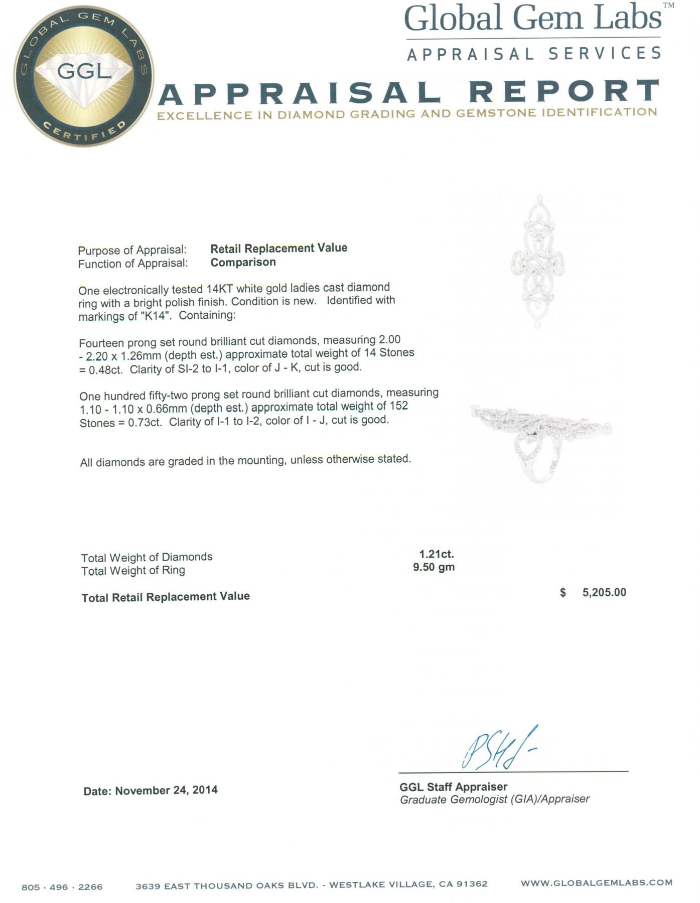 One electronically tested 14KT white gold ladies cast diamond ring with a bright polish finish. Identified with markings of "K14". Condition is new. Containing: Fourteen prong set round brilliant cut diamonds, measuring 2.00 - 2.20 x 1.26mm (depth est.) approximate total weight of 14 Stones = 0.48ct. Clarity: SI-2 to I-1. Color: J - K, Cut is Good. One Hundred Fifty-Two prong set round brilliant cut diamonds, measuring 1.10 - 1.10 x 0.66mm (depth est.) approximate total weight of 152 Stones = 0.73ct. Clarity: I-1 to I-2. Color: I - J, Cut is Good. All diamonds are graded in the mounting, unless otherwise stated. Total Weight of Diamonds 1.21ct. Total Weight of Ring 9.50 grams. GGL Appraised.