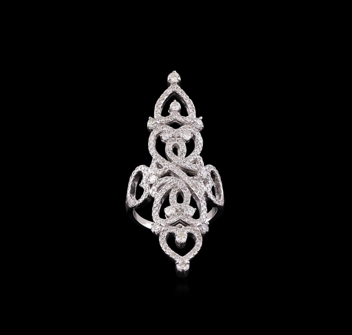 One electronically tested 14KT white gold ladies cast diamond ring with a bright polish finish. Identified with markings of "K14". Condition is new. Containing: Fourteen prong set round brilliant cut diamonds, measuring 2.00 - 2.20 x 1.26mm (depth est.) approximate total weight of 14 Stones = 0.48ct. Clarity: SI-2 to I-1. Color: J - K, Cut is Good. One Hundred Fifty-Two prong set round brilliant cut diamonds, measuring 1.10 - 1.10 x 0.66mm (depth est.) approximate total weight of 152 Stones = 0.73ct. Clarity: I-1 to I-2. Color: I - J, Cut is Good. All diamonds are graded in the mounting, unless otherwise stated. Total Weight of Diamonds 1.21ct. Total Weight of Ring 9.50 grams. GGL Appraised.