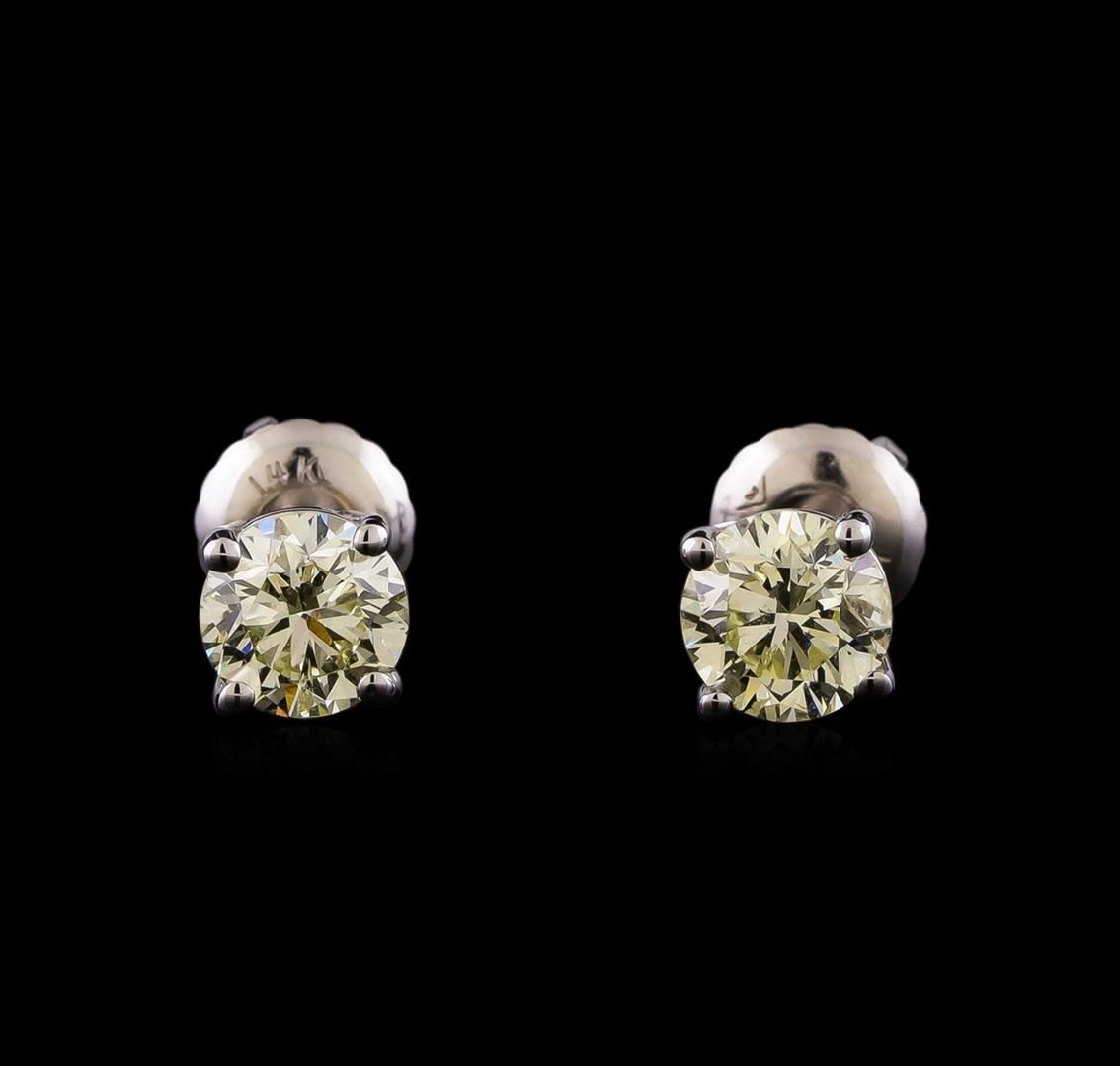 One pair electronically tested 14KT white gold cast & assembled diamond solitaire earrings with screw backs. Bright polish finish. Condition is new, good workmanship. Containing: One prong set round brilliant cut diamond, measuring 5.10 - 5.05 x 3.30mm (depth est.) approximate weight of 0.61ct with a faint blue fluorescence. Graded in the setting. Clarity: SI-2. Depth: 65.1%. Table 59.2%. One prong set round brilliant cut diamond, measuring 5.00 - 4.90 x 3.40mm (depth est.) approximate weight of 0.60ct with a faint blue fluorescence. Graded in the setting. Clarity: SI-2. Depth: 68.7%. Table 62.6%. Total Weight of Diamonds 1.21ct. Total Weight of Earrings 0.98 grams. AIG Appraised at $4,135.00.