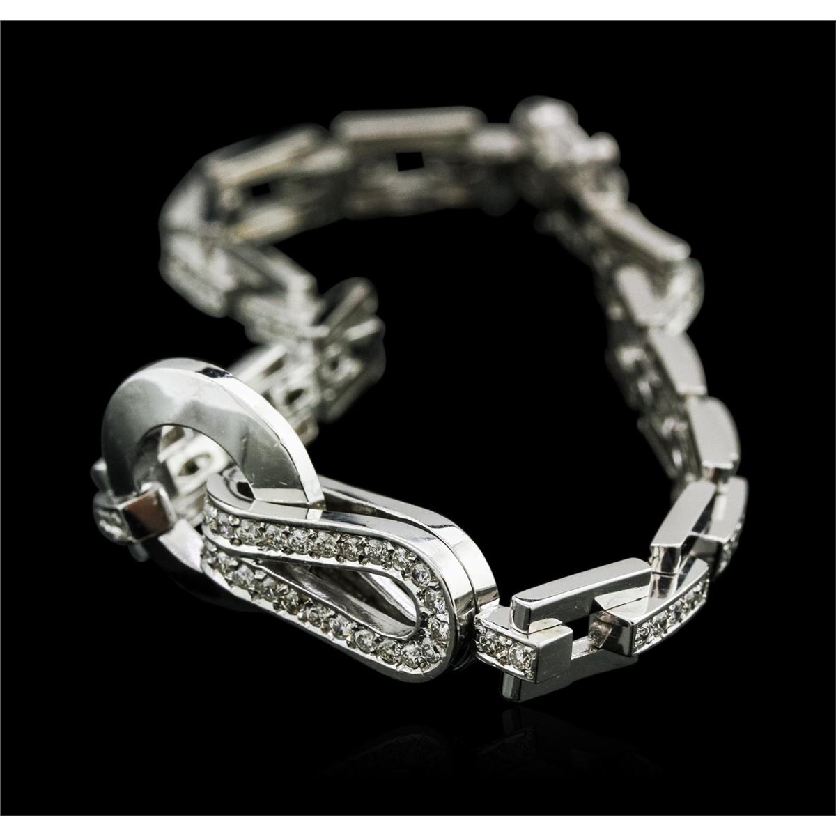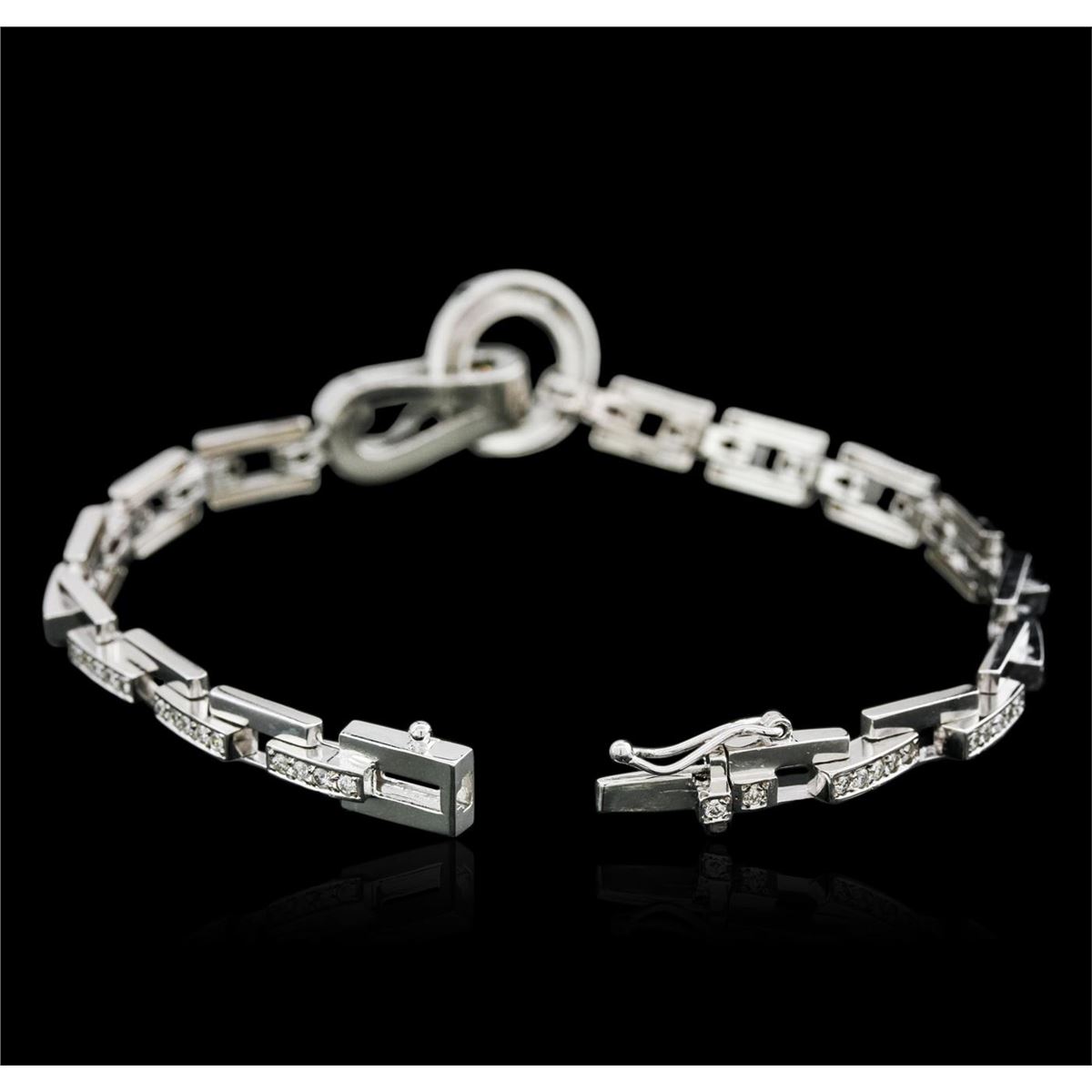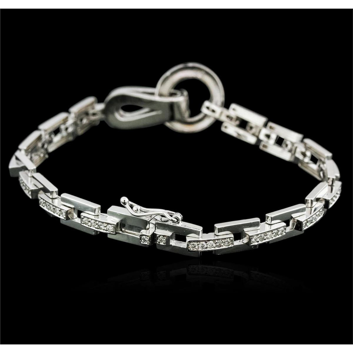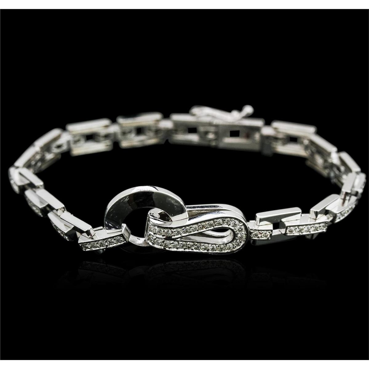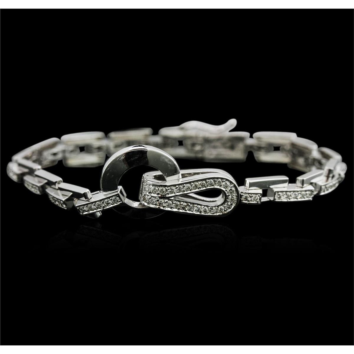 One electronically tested 14KT white gold ladies cast diamond bracelet with a hidden box clasp with safety closer with a bright polish finish. Measurements: 7.5" in length Identified with markings of "14K". Condition is new. Containing: Ninety-Eight channel set round brilliant cut diamonds, measuring 1.50 - 1.50 x 0.90mm (depth est.) approximate total weight of 98 Stones = 1.21ct. Clarity: SI-1 to SI-2. Color: I - J. All diamonds are graded in the mounting, unless otherwise stated. Total Weight of Diamonds 1.21ct. Total Weight of Bracelet 19.50 grams. GGL Appraised at $6,365.00.