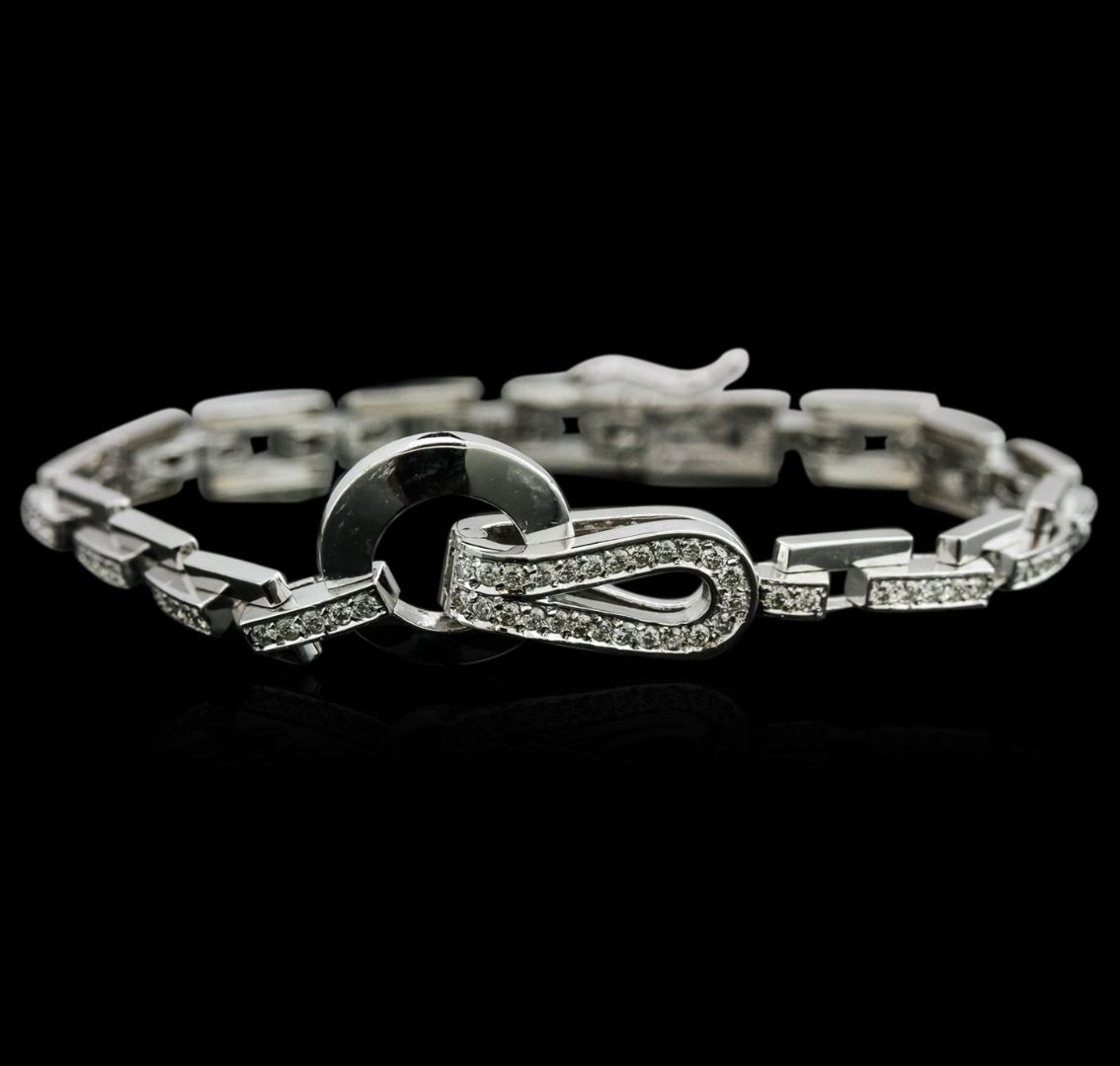 One electronically tested 14KT white gold ladies cast diamond bracelet with a hidden box clasp with safety closer with a bright polish finish. Measurements: 7.5" in length Identified with markings of "14K". Condition is new. Containing: Ninety-Eight channel set round brilliant cut diamonds, measuring 1.50 - 1.50 x 0.90mm (depth est.) approximate total weight of 98 Stones = 1.21ct. Clarity: SI-1 to SI-2. Color: I - J. All diamonds are graded in the mounting, unless otherwise stated. Total Weight of Diamonds 1.21ct. Total Weight of Bracelet 19.50 grams. GGL Appraised at $6,365.00.