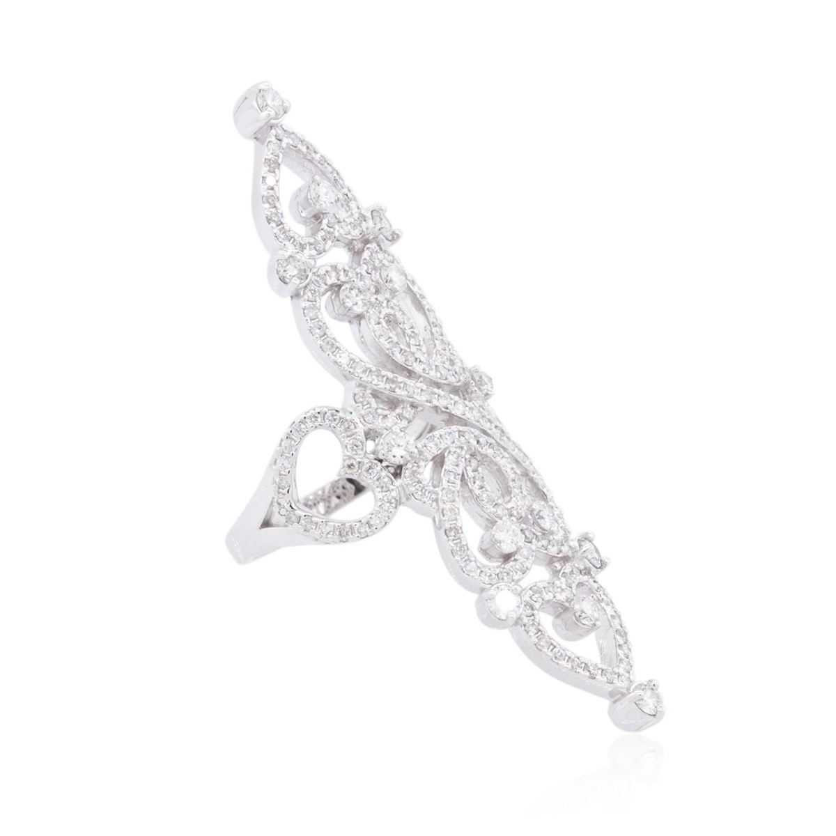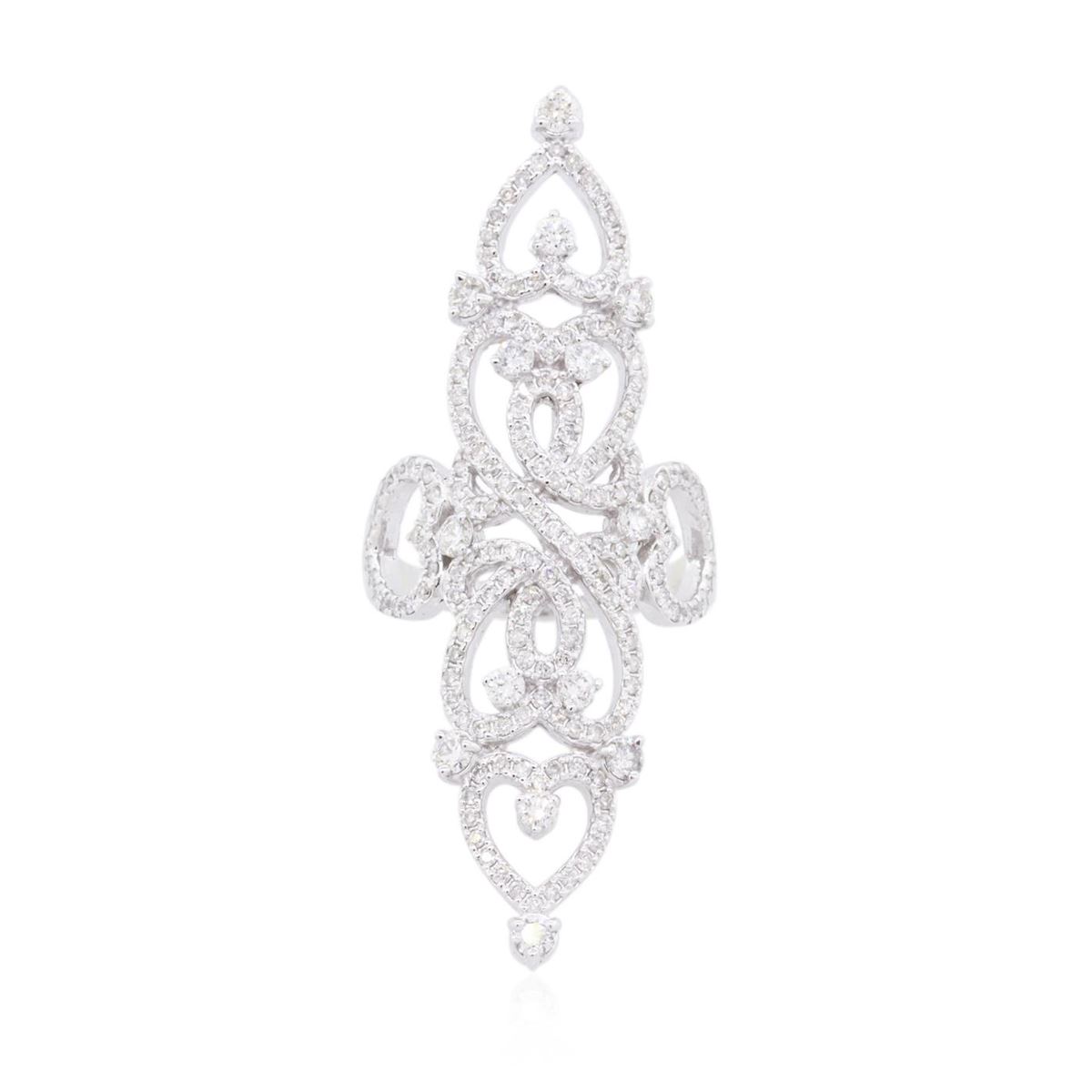 One electronically tested 14KT white gold ladies cast diamond ring with a bright polish finish. Identified with markings of "K14". Condition is new. Containing: Fourteen prong set round brilliant cut diamonds, measuring 2.00 - 2.20 x 1.26mm (depth est.) approximate total weight of 14 Stones = 0.48ct. Clarity: SI-2 to I-1. Color: J - K, Cut is Good. One Hundred Fifty-Two prong set round brilliant cut diamonds, measuring 1.10 - 1.10 x 0.66mm (depth est.) approximate total weight of 152 Stones = 0.73ct. Clarity: I-1 to I-2. Color: I - J, Cut is Good. All diamonds are graded in the mounting, unless otherwise stated. Total Weight of Diamonds 1.21ct. Total Weight of Ring 9.50 grams. GGL Appraised at $5,205.00.