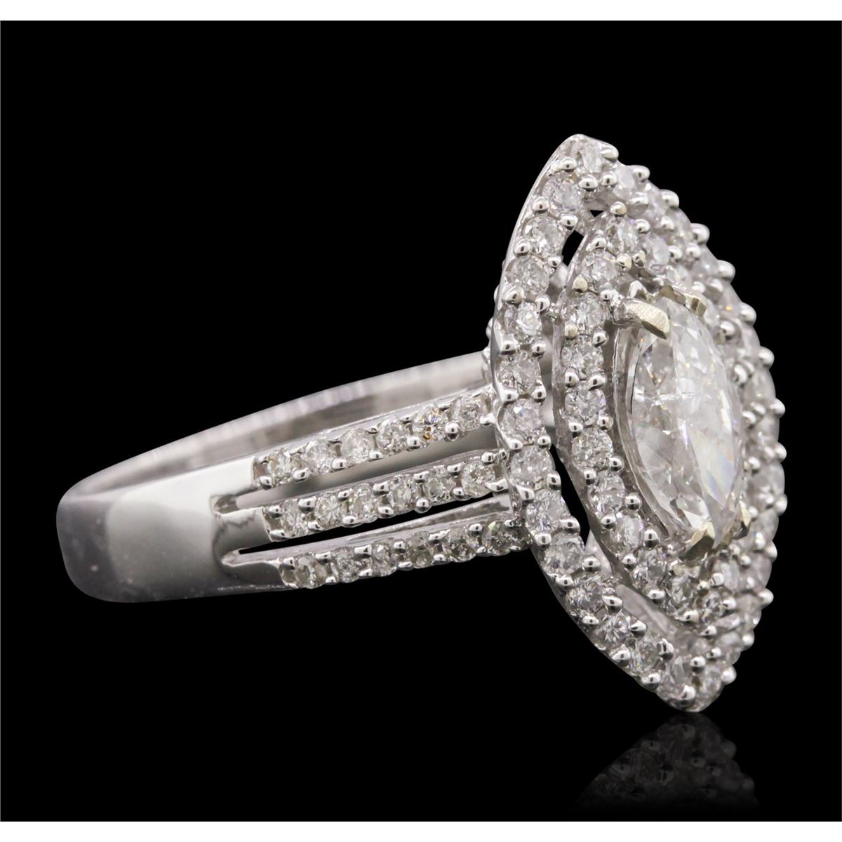 One electronically tested 14KT white gold Ladies combination cast & assembled engagement ring with a bright polish finish. Condition is new. Identified with markings of "14K". Containing: One prong set marquise shaped cut diamond, measuring 7.90 x 4.30 x 2.71mm (depth est.) approximate weight of 0.53ct. Clarity: I-2. Color: I, Cut is Good. Eighty-Four prong set round brilliant cut diamonds, measuring 1.30 - 1.30 x 0.78mm (depth est.) approximate. Total Weight of 84 Stones = 0.67ct. Clarity: I-1 to I-3. Color: H - I, Cut is Good. All grading of diamonds and colored gemstones in this piece of jewelry are graded in the mounting, unless otherwise stated. Total Weight of Diamonds 1.21ct. Total Weight of Engagement Ring 4.90 grams. GGL Appraised at $5,410.00.