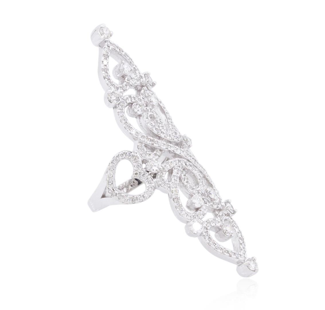 One electronically tested 14KT white gold ladies cast diamond ring with a bright polish finish. Identified with markings of "K14". Condition is new. Containing: Fourteen prong set round brilliant cut diamonds, measuring 2.00 - 2.20 x 1.26mm (depth est.) approximate total weight of 14 Stones = 0.48ct. Clarity: SI-2 to I-1. Color: J - K, Cut is Good. One Hundred Fifty-Two prong set round brilliant cut diamonds, measuring 1.10 - 1.10 x 0.66mm (depth est.) approximate total weight of 152 Stones = 0.73ct. Clarity: I-1 to I-2. Color: I - J, Cut is Good. All diamonds are graded in the mounting, unless otherwise stated. Total Weight of Diamonds 1.21ct. Total Weight of Ring 9.50 grams. GGL Appraised at $5,205.00.
