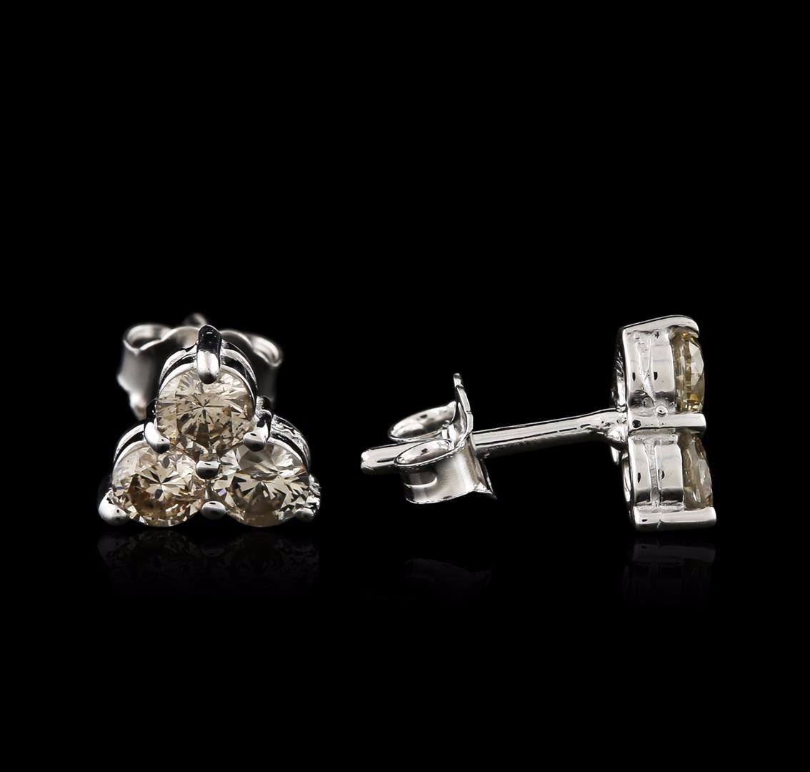 One pair electronically tested 14KT white gold ladies cast diamond earrings with friction posts with a bright polish finish. Identified with markings of "585". Condition is new. Containing: Six prong set round brilliant cut diamonds, measuring 3.50 - 3.50 x 2.10mm (depth est.) approximate total weight of 6 Stones = 1.22ct. Clarity: I-1 to I-2. Color: L - M, Cut is Good. Diamonds are graded in the mounting, unless otherwise stated. Total Weight of Diamonds 1.22ct. Total Weight of Earrings 2.00 grams. GGL Appraised at $1,545.00.