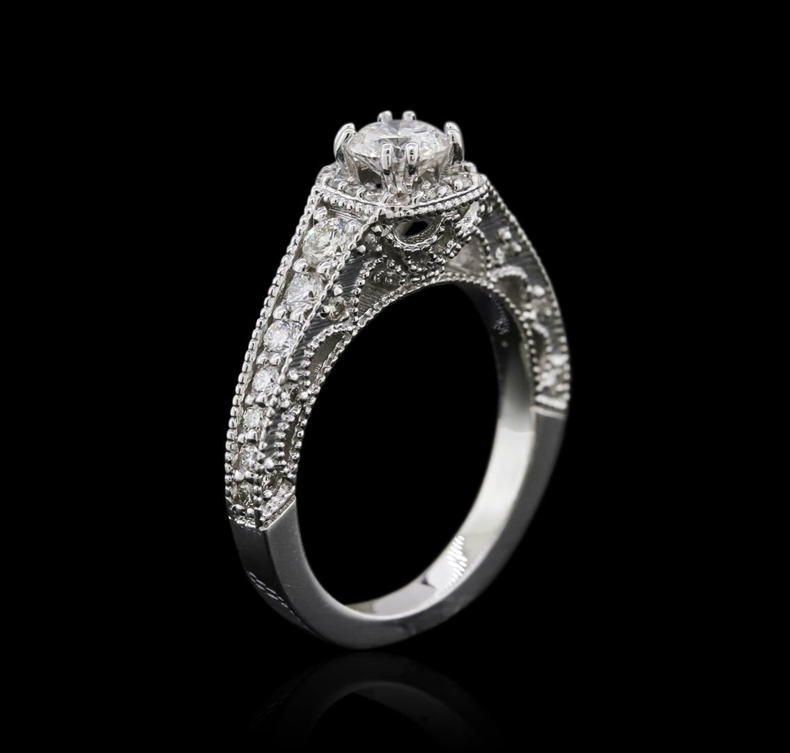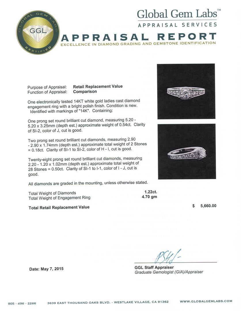 One electronically tested 14KT white gold ladies cast diamond engagement ring with a bright polish finish. Identified with markings of "14K". Condition is new. Containing: One prong set round brilliant cut diamond, measuring 5.20 - 5.20 x 3.25mm (depth est.) approximate weight of 0.54ct. Clarity: SI-2. Color: J, Cut is Good. Two prong set round brilliant cut diamonds, measuring 2.90 - 2.90 x 1.74mm (depth est.) approximate total weight of 2 Stones = 0.18ct. Clarity: SI-1 to SI-2. Color: H - I, Cut is Good. Twenty-Eight prong set round brilliant cut diamonds, measuring 2.20 - 1.20 x 1.02mm (depth est.) approximate total weight of 28 Stones = 0.50ct. Clarity: SI-1 to I-1. Color: I - J, Cut is Good. All diamonds are graded in the mounting, unless otherwise stated. Total Weight of Diamonds 1.22ct. Total Weight of Engagement Ring 4.70 grams. GGL Appraised at $5,660.00.