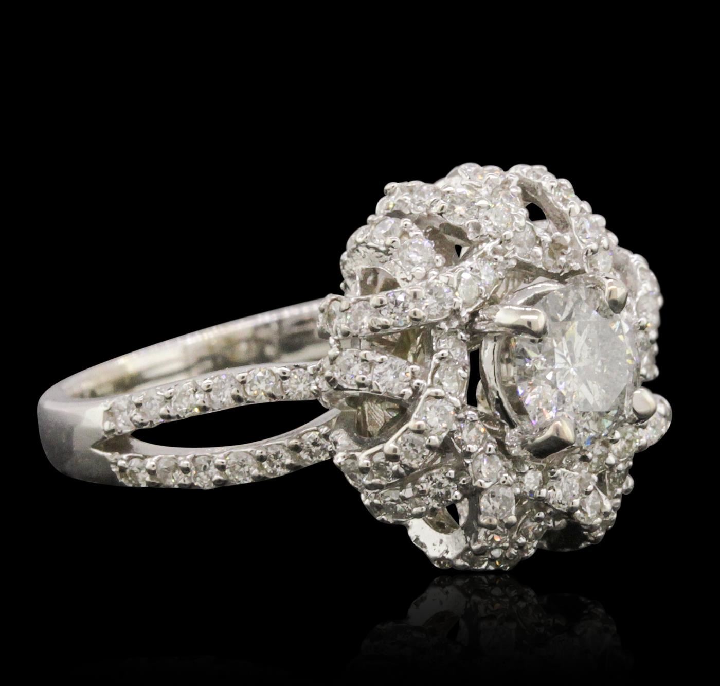 One electronically tested 14KT white gold ladies combination cast & assembled engagement ring with a bright polish finish. Condition is new. Identified with markings of "K14". Containing: One prong set round brilliant cut diamond, measuring 5.70 - 5.27 x 3.54mm (depth est.) approximate weight of 0.65ct. Clarity: I-2. Color: J, Cut is Good. One Hundred Eighteen prong set round brilliant cut diamonds, measuring 1.10 - 1.10 x 0.66mm (depth est.) approximate. Total Weight of 118 Stones = 0.57ct. Clarity: SI-2 to I-2. Color: I - J, Cut is Good. All diamonds are graded in the mounting, unless otherwise stated. Total Weight of Diamonds 1.22ct. Total Weight of Ring 6.20 grams. GGL Appraised at $6,395.00.
