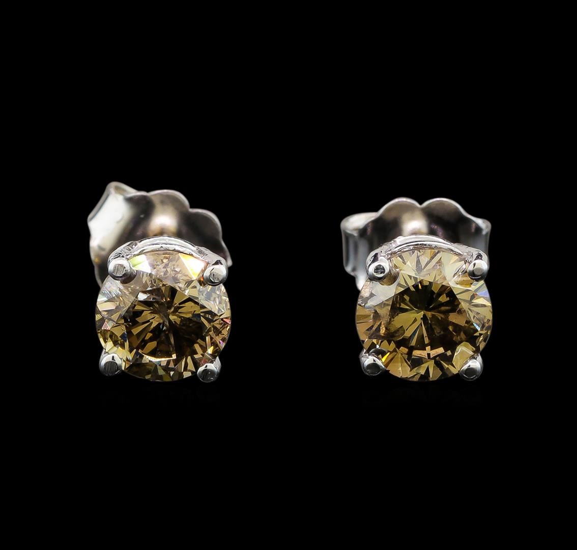 One pair electronically tested 14KT white gold ladies cast diamond stud earrings with friction posts with a bright polish finish. Identified with markings of "14K". Condition is new. Containing: Two prong set round brilliant cut diamonds, measuring 5.50 - 5.50 x 3.30mm (depth est.) approximate total weight of 2 Stones = 1.22ct. Clarity: I-1, Cut is Good. Diamonds are graded in the mounting, unless otherwise stated. Total Weight of Diamonds 1.22ct. Total Weight of Stud Earrings 1.20 grams. GGL Appraised at $2,385.00.