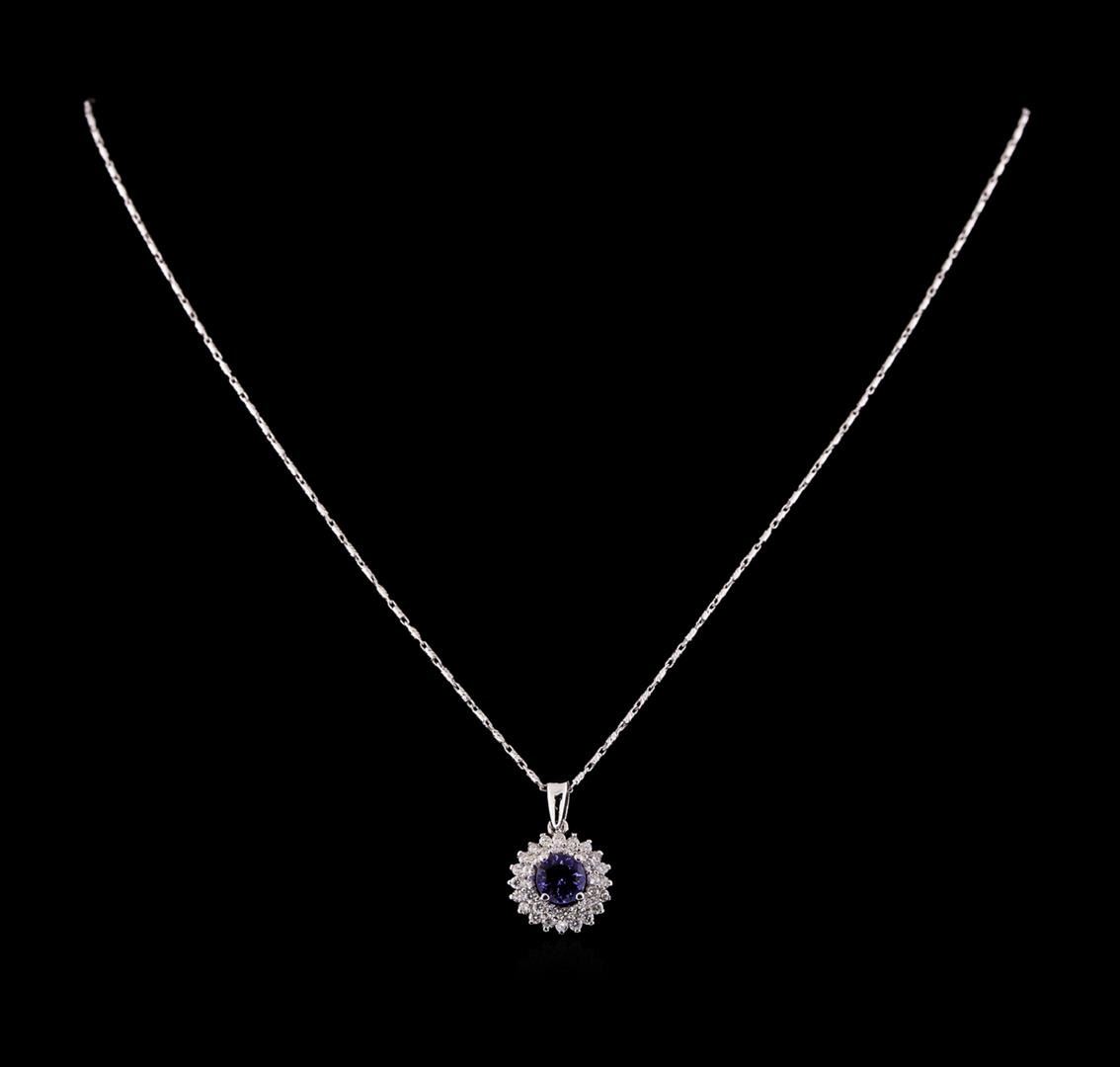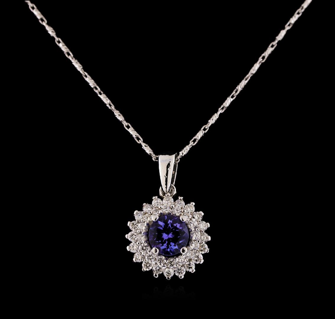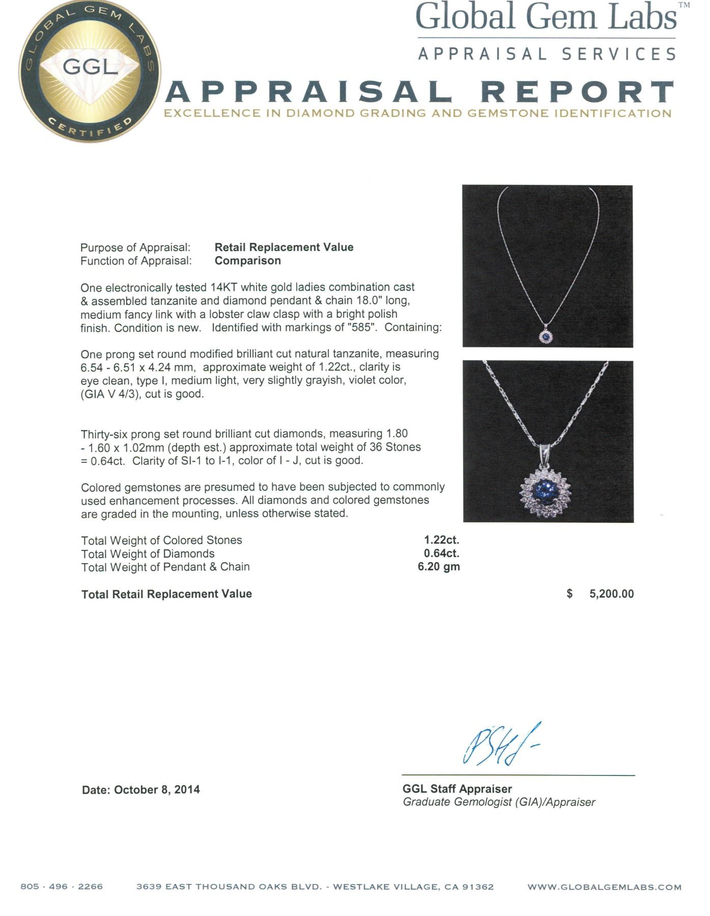 One electronically tested 14KT white gold ladies combination cast & assembled tanzanite and diamond pendant & chain 18.0" long, medium fancy link with a lobster claw clasp with a bright polish finish. Identified with markings of "585". Condition is new. Containing: One prong set round modified brilliant cut natural tanzanite, measuring 6.54 - 6.51 x 4.24 mm, approximate weight of 1.22ct., clarity is eye clean, type I, medium light, very slightly grayish, violet color, (GIA V 4/3), cut is good. Thirty-Six prong set round brilliant cut diamonds, measuring 1.80 - 1.60 x 1.02mm (depth est.) approximate total weight of 36 Stones = 0.64ct. Clarity: SI-1 to I-1. Color: I - J, Cut is Good. Colored gemstones are presumed to have been subjected to commonly used enhancement processes. All diamonds and colored gemstones are graded in the mounting, unless otherwise stated. Total Weight of Colored Stones 1.22ct. Total Weight of Diamonds 0.64ct. Total Weight of Pendant & Chain 6.20 grams. GGL Appraised.