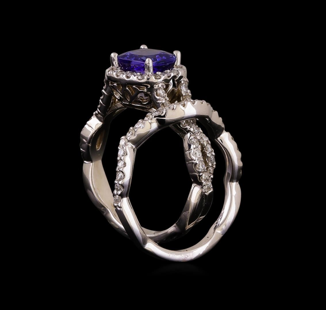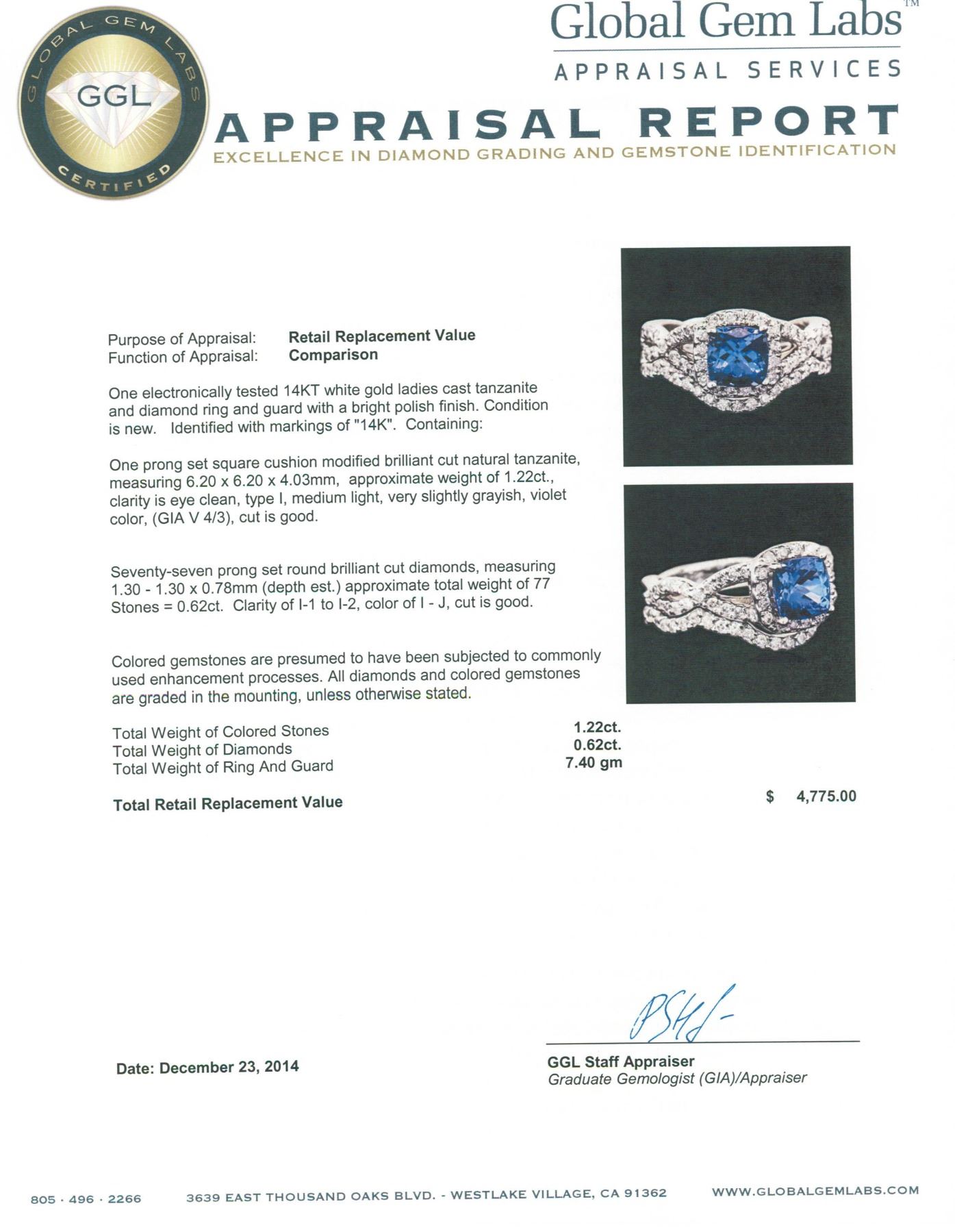 One electronically tested 14KT white gold ladies cast tanzanite and diamond ring and guard with a bright polish finish. Identified with markings of "14K". Condition is new. Containing: One prong set square cushion modified brilliant cut natural tanzanite, measuring 6.20 x 6.20 x 4.03mm, approximate weight of 1.22ct., clarity is eye clean, type I, medium light, very slightly grayish, violet color, (GIA V 4/3), cut is good. Seventy-Seven prong set round brilliant cut diamonds, measuring 1.30 - 1.30 x 0.78mm (depth est.) approximate total weight of 77 Stones = 0.62ct. Clarity: I-1 to I-2. Color: I - J, Cut is Good. Colored gemstones are presumed to have been subjected to commonly used enhancement processes. All diamonds and colored gemstones are graded in the mounting, unless otherwise stated. Total Weight of Colored Stones 1.22ct. Total Weight of Diamonds 0.62ct. Total Weight of Ring And Guard 7.40 grams. GGL Appraised.