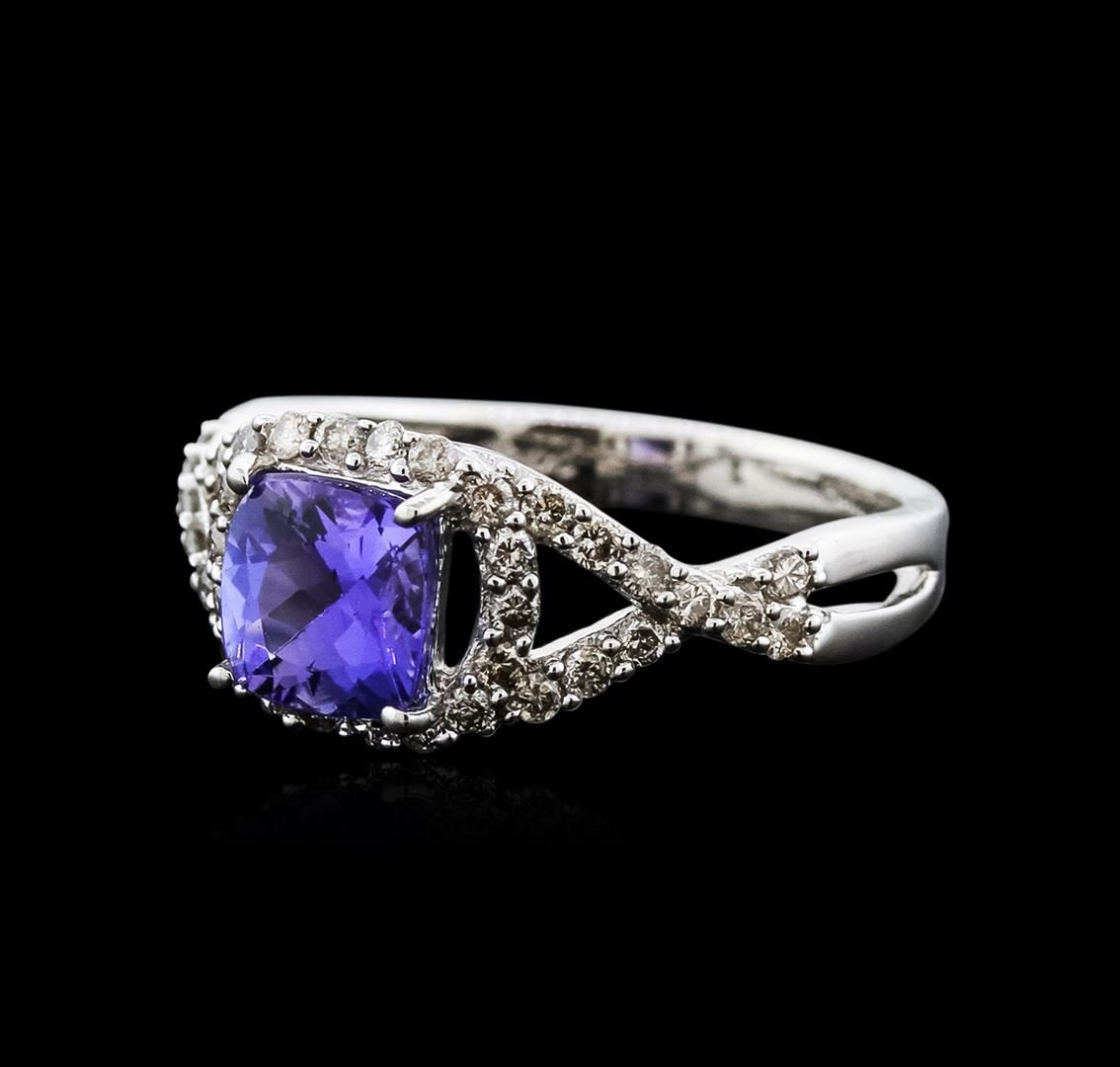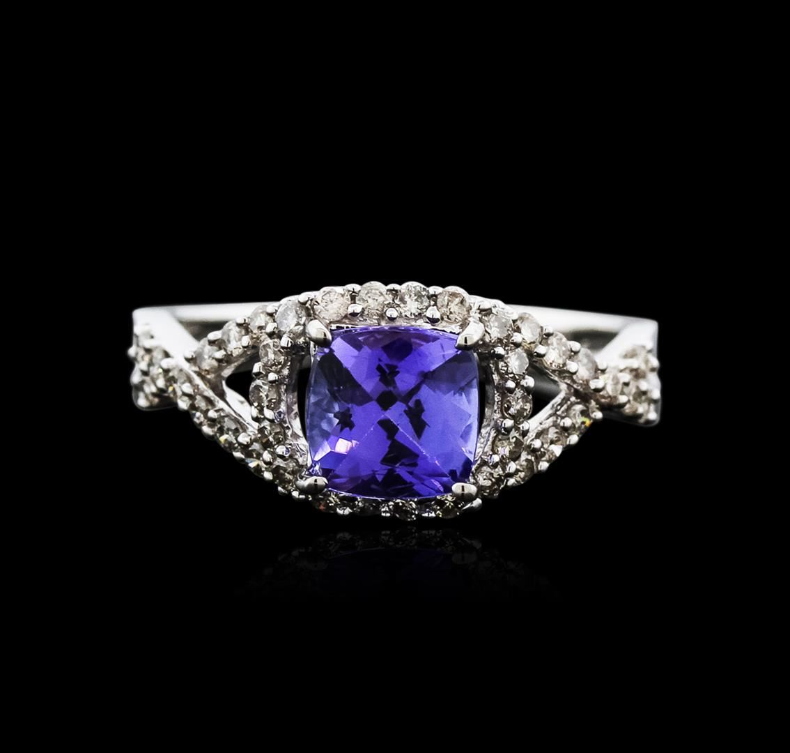 One electronically tested 14KT white gold ladies cast tanzanite and diamond ring with a bright polish finish. Identified with markings of "14K". Condition is new. Containing: One prong set square cushion modified brilliant cut natural tanzanite, measuring 6.20 x 6.20 x 4.03mm, approximate weight of 1.22ct., clarity is eye clean, type I, medium light, very slightly grayish, violet color, (GIA V 4/3), cut is good. Thirty-Six prong set round brilliant cut diamonds, measuring 1.20 - 1.20 x 0.72mm (depth est.) approximate total weight of 36 Stones = 0.23ct. Clarity: SI-2 to I-2. Color: I - J. All diamonds and colored gemstones are graded in the mounting, unless otherwise stated. Colored gemstones are presumed to have been subjected to commonly used enhancement processes. Total Weight of Colored Stones 1.22ct. Total Weight of Diamonds 0.23ct. Total Weight of Ring 3.30 grams. GGL Appraised at $2,990.00.