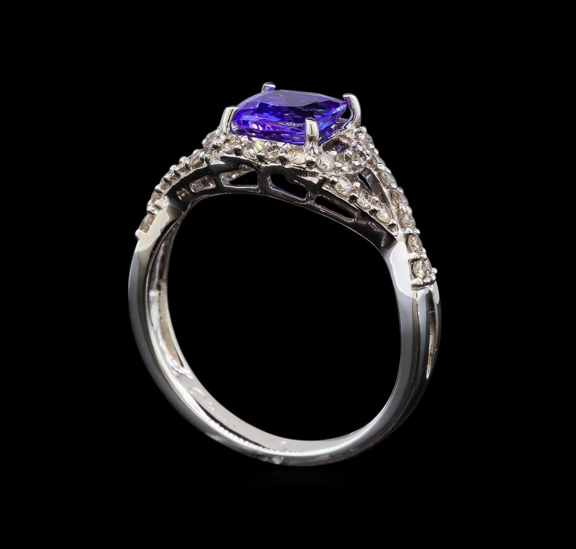 One electronically tested 14KT white gold ladies cast tanzanite and diamond ring with a bright polish finish. Identified with markings of "14K". Condition is new. Containing: One prong set square cushion modified brilliant cut natural tanzanite, measuring 6.20 x 6.20 x 4.03mm, approximate weight of 1.22ct., clarity is eye clean, type I, medium light, very slightly grayish, violet color, (GIA V 4/3), cut is good. Thirty-Six prong set round brilliant cut diamonds, measuring 1.20 - 1.20 x 0.72mm (depth est.) approximate total weight of 36 Stones = 0.23ct. Clarity: SI-2 to I-2. Color: I - J. All diamonds and colored gemstones are graded in the mounting, unless otherwise stated. Colored gemstones are presumed to have been subjected to commonly used enhancement processes. Total Weight of Colored Stones 1.22ct. Total Weight of Diamonds 0.23ct. Total Weight of Ring 3.30 grams. GGL Appraised at $2,990.00.