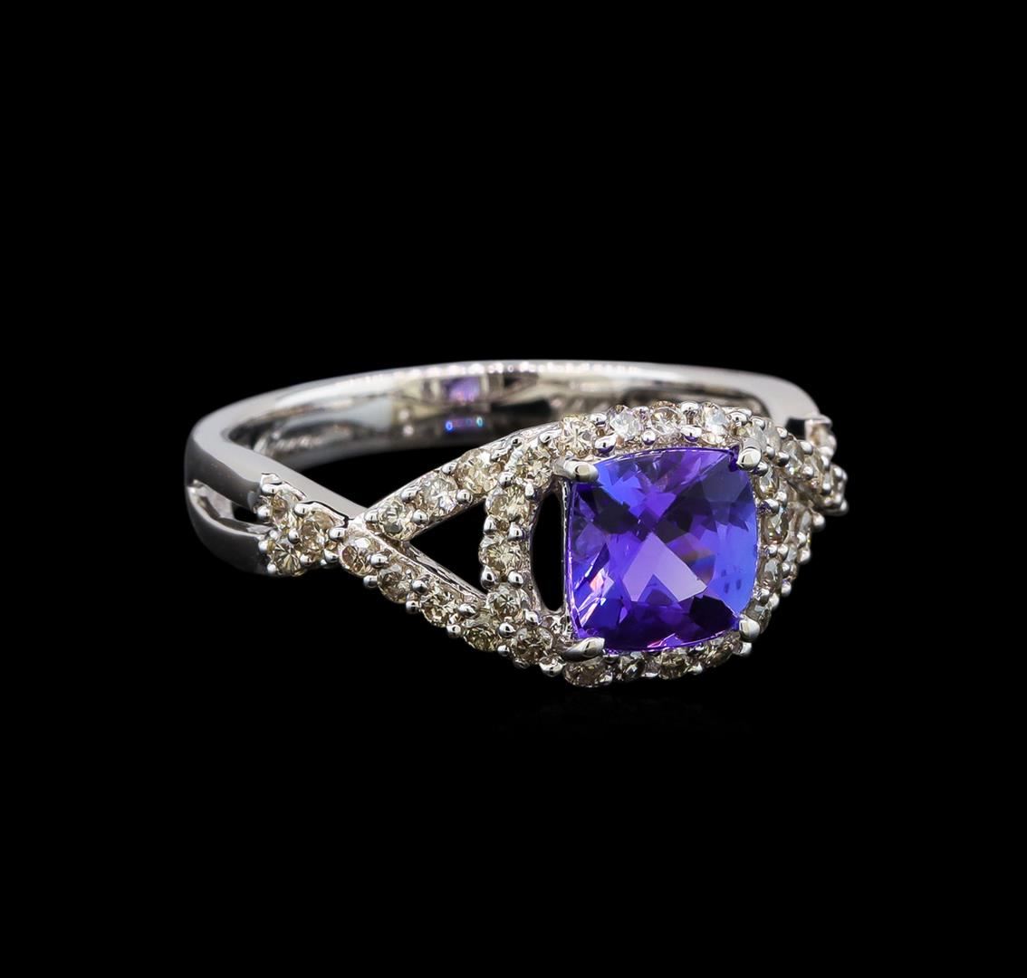 One electronically tested 14KT white gold ladies cast tanzanite and diamond ring with a bright polish finish. Identified with markings of "14K". Condition is new. Containing: One prong set square cushion modified brilliant cut natural tanzanite, measuring 6.20 x 6.20 x 4.03mm, approximate weight of 1.22ct., clarity is eye clean, type I, medium light, very slightly grayish, violet color, (GIA V 4/3), cut is good. Thirty-Six prong set round brilliant cut diamonds, measuring 1.20 - 1.20 x 0.72mm (depth est.) approximate total weight of 36 Stones = 0.23ct. Clarity: SI-2 to I-2. Color: I - J. All diamonds and colored gemstones are graded in the mounting, unless otherwise stated. Colored gemstones are presumed to have been subjected to commonly used enhancement processes. Total Weight of Colored Stones 1.22ct. Total Weight of Diamonds 0.23ct. Total Weight of Ring 3.30 grams. GGL Appraised at $2,990.00.