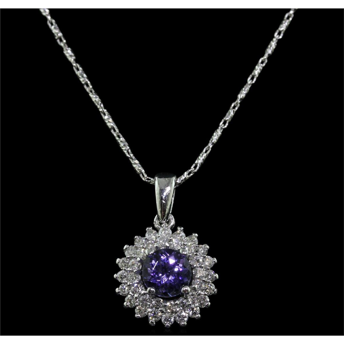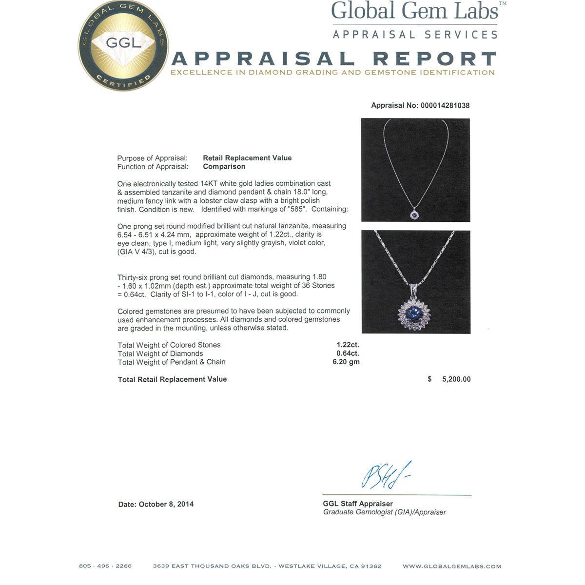 One electronically tested 14KT white gold ladies combination cast & assembled tanzanite and diamond pendant & chain 18.0" long, medium fancy link with a lobster claw clasp with a bright polish finish. Identified with markings of "585". Condition is new. Containing: One prong set round modified brilliant cut natural tanzanite, measuring 6.54 - 6.51 x 4.24 mm, approximate weight of 1.22ct., clarity is eye clean, type I, medium light, very slightly grayish, violet color, (GIA V 4/3), cut is good. Thirty-Six prong set round brilliant cut diamonds, measuring 1.80 - 1.60 x 1.02mm (depth est.) approximate total weight of 36 Stones = 0.64ct. Clarity: SI-1 to I-1. Color: I - J, Cut is Good. Colored gemstones are presumed to have been subjected to commonly used enhancement processes. All diamonds and colored gemstones are graded in the mounting, unless otherwise stated. Total Weight of Colored Stones 1.22ct. Total Weight of Diamonds 0.64ct. Total Weight of Pendant & Chain 6.20 grams. GGL Appraised at $5,200.00.