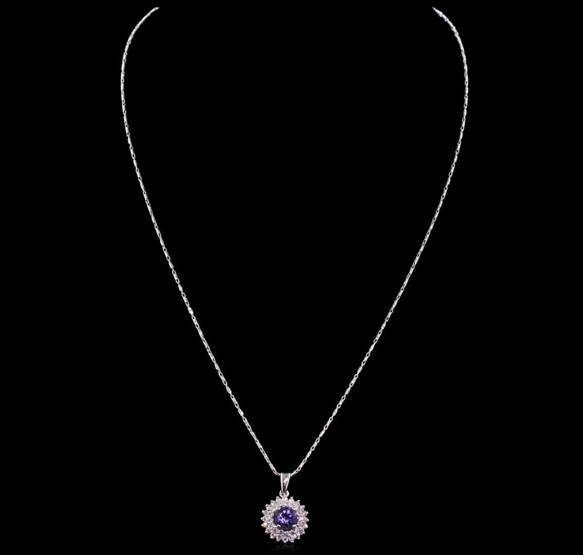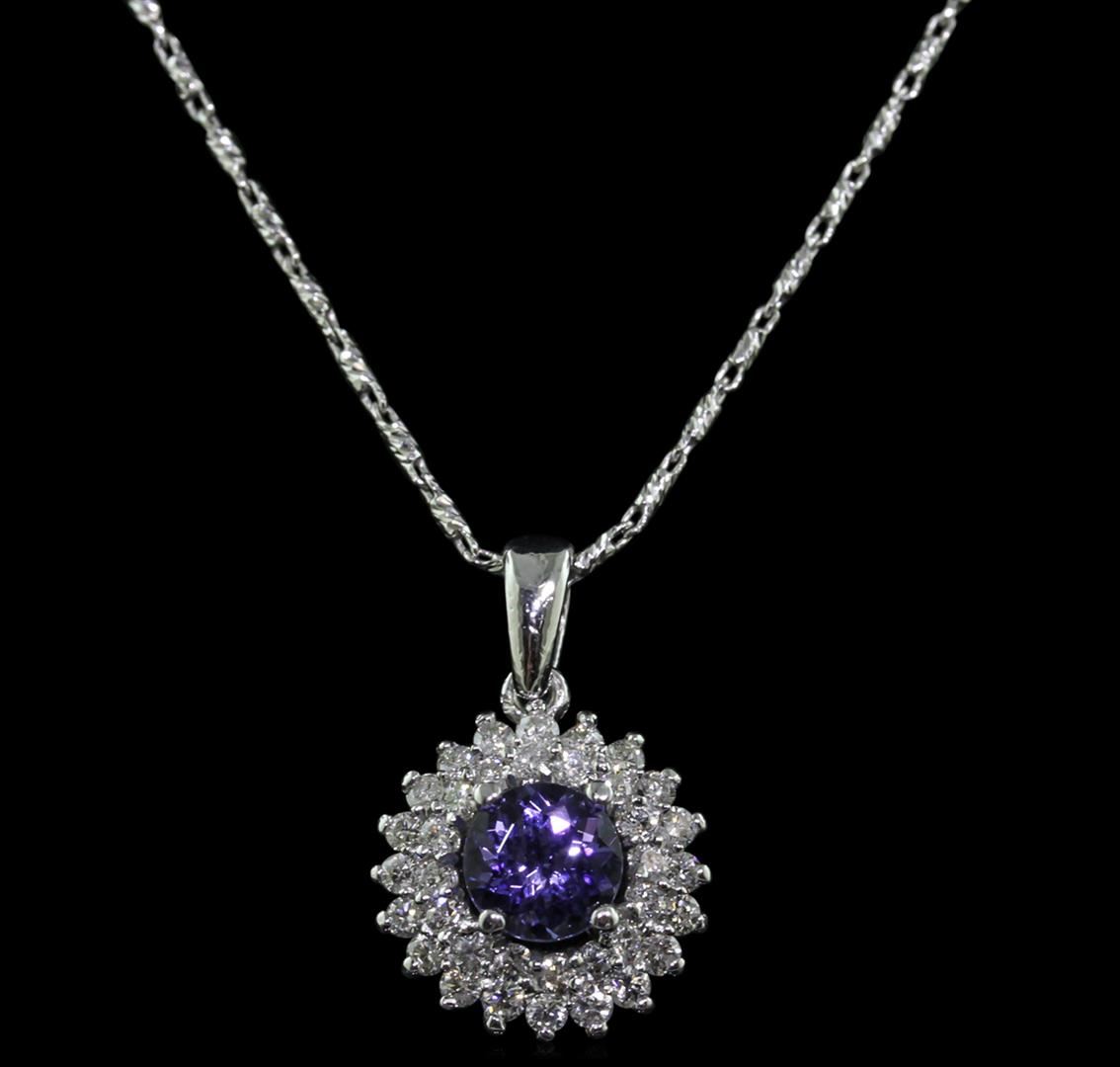 One electronically tested 14KT white gold ladies combination cast & assembled tanzanite and diamond pendant & chain 18.0" long, medium fancy link with a lobster claw clasp with a bright polish finish. Identified with markings of "585". Condition is new. Containing: One prong set round modified brilliant cut natural tanzanite, measuring 6.54 - 6.51 x 4.24 mm, approximate weight of 1.22ct., clarity is eye clean, type I, medium light, very slightly grayish, violet color, (GIA V 4/3), cut is good. Thirty-Six prong set round brilliant cut diamonds, measuring 1.80 - 1.60 x 1.02mm (depth est.) approximate total weight of 36 Stones = 0.64ct. Clarity: SI-1 to I-1. Color: I - J, Cut is Good. Colored gemstones are presumed to have been subjected to commonly used enhancement processes. All diamonds and colored gemstones are graded in the mounting, unless otherwise stated. Total Weight of Colored Stones 1.22ct. Total Weight of Diamonds 0.64ct. Total Weight of Pendant & Chain 6.20 grams. GGL Appraised at $5,200.00.